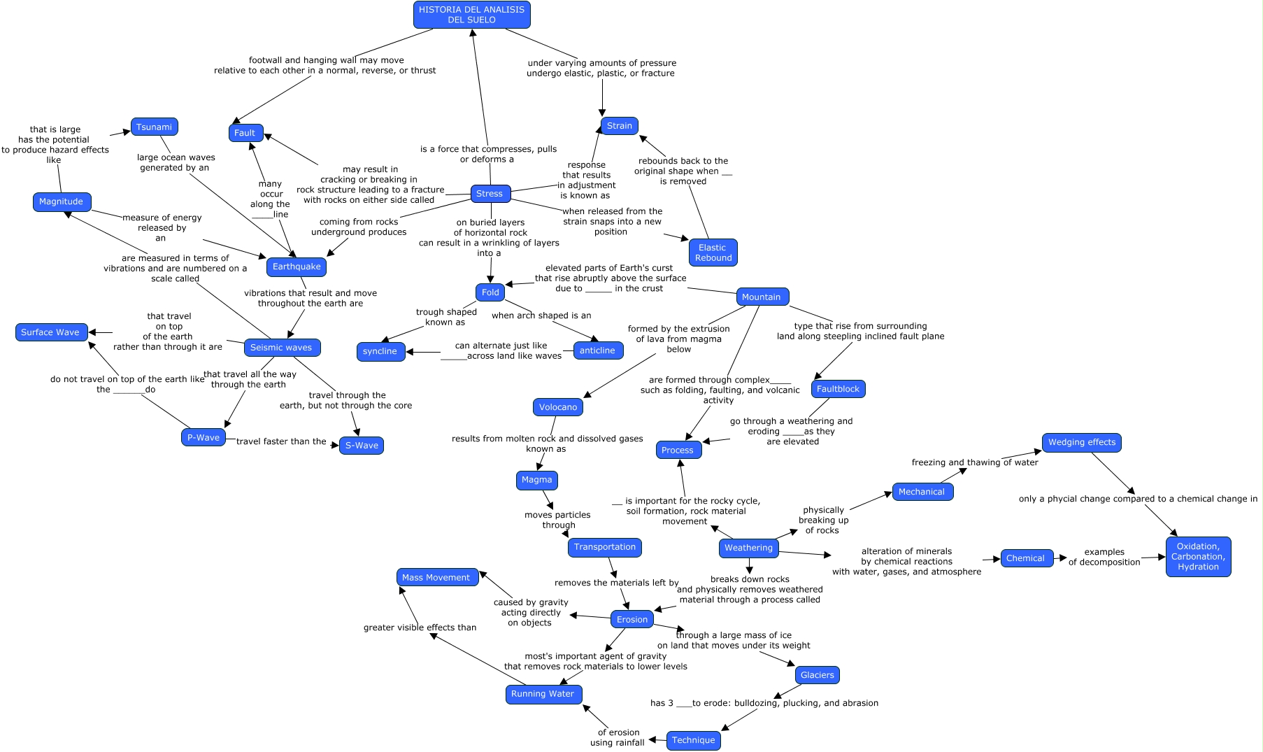 Este Cmap, tiene información relacionada con: Rubino-Earth's Surface ch 16, Weathering physically breaking up of rocks Mechanical, Erosion caused by gravity acting directly on objects Mass Movement, Faultblock go through a weathering and eroding ____as they are elevated Process, Stress when released from the strain snaps into a new position Elastic Rebound, Glaciers has 3 ___to erode: bulldozing, plucking, and abrasion Technique, anticline can alternate just like _____across land like waves syncline, Stress coming from rocks underground produces Earthquake, Transportation removes the materials left by Erosion, Earthquake vibrations that result and move throughout the earth are Seismic waves, Magnitude that is large has the potential to produce hazard effects like Tsunami, Wedging effects only a phycial change compared to a chemical change in Oxidation, Carbonation, Hydration, Mountain formed by the extrusion of lava from magma below Volocano, Seismic waves that travel on top of the earth rather than through it are Surface Wave, Mechanical freezing and thawing of water Wedging effects, Stress response that results in adjustment is known as Strain, Weathering alteration of minerals by chemical reactions with water, gases, and atmosphere Chemical, Fold when arch shaped is an anticline, Magnitude measure of energy released by an Earthquake, Volocano results from molten rock and dissolved gases known as Magma, Mountain type that rise from surrounding land along steepling inclined fault plane Faultblock