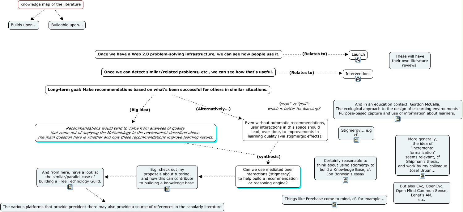 This Concept Map, created with IHMC CmapTools, has information related to: 5-Thesis, And from here, have a look at the similar/parallel case of building a Free Technology Guild. The various platforms that provide precident there may also provide a source of references in the scholarly literature, E.g. check out my proposals about tutoring, and how this can contribute to building a knowledge base. And from here, have a look at the similar/parallel case of building a Free Technology Guild., Can we use mediated peer interactions (stigmergy) to help build a recommendation or reasoning engine? E.g. check out my proposals about tutoring, and how this can contribute to building a knowledge base., Knowledge map of the literature Buildable upon..., Knowledge map of the literature Builds upon..., Even without automatic recommendations, user interactions in this space should lead, over time, to improvements in learning quality (via stigmergic effects). (synthesis) Can we use mediated peer interactions (stigmergy) to help build a recommendation or reasoning engine?, Recommendations would tend to come from analyses of quality that come out of applying the Methodology in the environment described above. The main question here is whether and how these recommendations improve learning results. (synthesis) Can we use mediated peer interactions (stigmergy) to help build a recommendation or reasoning engine?, Long-term goal: Make recommendations based on what's been successful for others in similar situations. (Alternatively...) Even without automatic recommendations, user interactions in this space should lead, over time, to improvements in learning quality (via stigmergic effects)., Long-term goal: Make recommendations based on what's been successful for others in similar situations. (Big idea) Recommendations would tend to come from analyses of quality that come out of applying the Methodology in the environment described above. The main question here is whether and how these recommendations improve learning results., Once we can detect similar/related problems, etc., we can see how that's useful. (Relates to) Interventions, Once we have a Web 2.0 problem-solving infrastructure, we can see how people use it. (Relates to) Launch