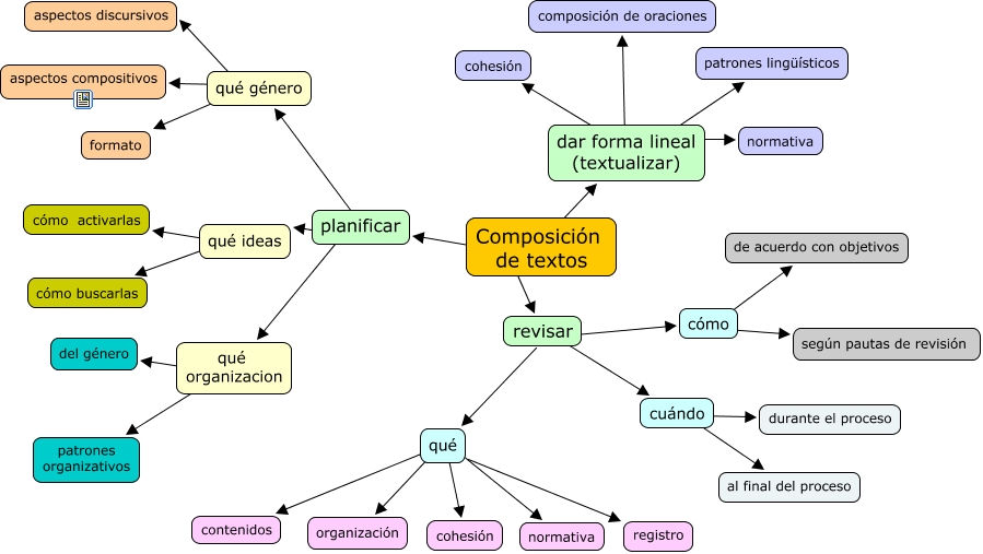 Este Cmap, tiene información relacionada con: composición de textos, qué ???? organización, cómo ???? según pautas de revisión, qué género ???? aspectos discursivos, qué ???? cohesión, planificar ???? qué organizacion, revisar ???? cuándo, revisar ???? qué, qué organizacion ???? patrones organizativos, planificar ???? qué género, qué género ???? formato, Composición de textos ???? dar forma lineal (textualizar), Composición de textos ???? revisar, dar forma lineal (textualizar) ???? patrones lingüísticos, qué ideas ???? cómo buscarlas, qué género ???? aspectos compositivos, dar forma lineal (textualizar) ???? cohesión, qué ???? contenidos, dar forma lineal (textualizar) ???? composición de oraciones, cómo ???? de acuerdo con objetivos, qué organizacion ???? del género
