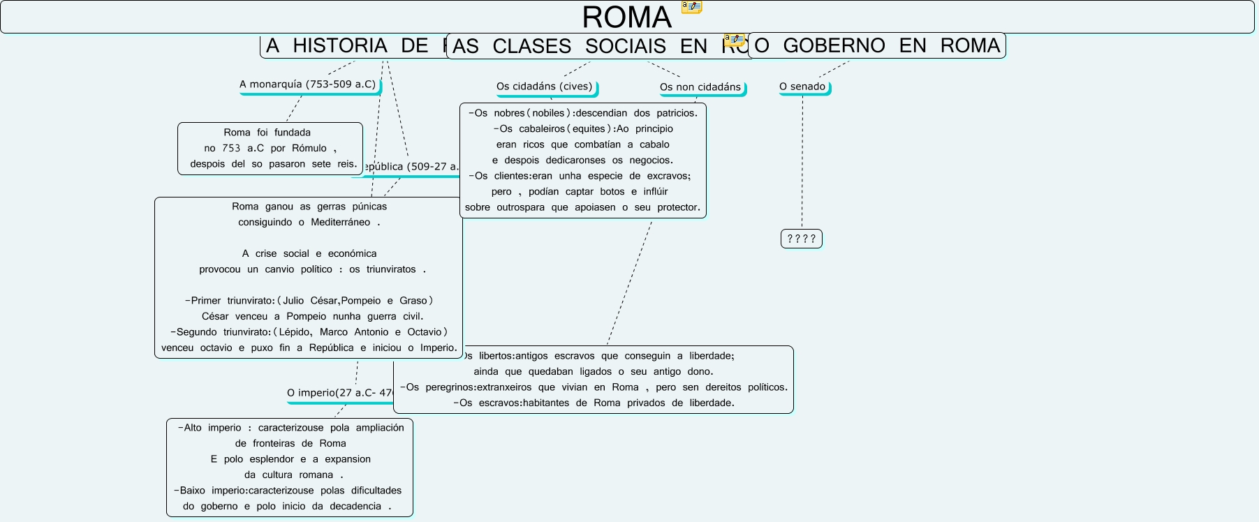 Este mapa conceptual ten información relativa a: cmap_03_kevin, AS CLASES SOCIAIS EN ROMA Os non cidadáns -Os libertos:antigos escravos que conseguin a liberdade; ainda que quedaban ligados o seu antigo dono. -Os peregrinos:extranxeiros que vivian en Roma , pero sen dereitos políticos. -Os escravos:habitantes de Roma privados de liberdade., O GOBERNO EN ROMA O senado ????, A HISTORIA DE ROMA O imperio(27 a.C- 476 d.C) -Alto imperio : caracterizouse pola ampliación de fronteiras de Roma E polo esplendor e a expansion da cultura romana . -Baixo imperio:caracterizouse polas dificultades do goberno e polo inicio da decadencia ., AS CLASES SOCIAIS EN ROMA Os cidadáns (cives) -Os nobres(nobiles):descendian dos patricios. -Os cabaleiros(equites):Ao principio eran ricos que combatían a cabalo e despois dedicaronses os negocios. -Os clientes:eran unha especie de excravos; pero , podían captar botos e inflúir sobre outrospara que apoiasen o seu protector., A HISTORIA DE ROMA A monarquía (753-509 a.C) Roma foi fundada no 753 a.C por Rómulo , despois del so pasaron sete reis., A HISTORIA DE ROMA A república (509-27 a.C) Roma ganou as gerras púnicas consiguindo o Mediterráneo . A crise social e económica provocou un canvio político : os triunviratos . -Primer triunvirato:(Julio César,Pompeio e Graso) César venceu a Pompeio nunha guerra civil. -Segundo triunvirato:(Lépido, Marco Antonio e Octavio) venceu octavio e puxo fin a República e iniciou o Imperio.