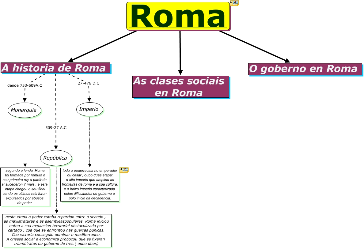 Este mapa conceptual ten información relativa a: cmap_03_Jorge, A historia de Roma 27-476 D.C Imperio, Monarquia ???? segundo a lenda ,Roma foi formada por romulo o seu primeiro rey a partir de ai sucederon 7 mais , e esta etapa chegou o seu final cando os ultimos reis foron expulsados por abusos de poder., Imperio ???? todo o poderrecaia no emperador ou cesar , oubo duas etapa: o alto imperio que ampliou as fronteiras de roma e a sua cultura. e o baixo imperio caracterizada polas dificultades de goberno e polo inicio da decadencia., Roma ???? O goberno en Roma, Roma ???? A historia de Roma, A historia de Roma 509-27 A.C República, República ???? nesta etapa o poder estaba repartido entre o senado , as maxistraturas e as asembleaspopulares. Roma iniciou enton a sua expansion territorial obstaculizada por cartago , coa que se enfrontou nas guerras punicas. Coa victoria conseguiu dominar o mediterraneo. A crisese social e economica probocou que se fixeran triumbiratos ou goberno de tres.( oubo dous), Roma ???? As clases sociais en Roma, A historia de Roma dende 753-509A.C Monarquia