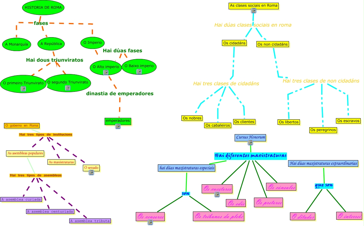 Este mapa conceptual ten información relativa a: cmap_03_adara, O Alto imperio dinastia de emperadores emperadores, As clases sociais en Roma Hai dúas clases sociais en roma Os cidadáns, Os cidadáns Hai tres clases de cidadáns Os nobres, Os cidadáns Hai tres clases de cidadáns Os cabaleiros, Os non cidadáns Hai tres clases de non cidadáns Os libertos, A República Hai dous triunviratos O primeiro Triunvirato, A República Hai dous triunviratos O segundo Triunvirato, As asembleas populares Hai tres tipos de asembleas A asemblea curiada, Cursus Honorum Hai diferentes maxistraturas Os pretores, HISTORIA DE ROMA fases O Imperio, As clases sociais en Roma Hai dúas clases sociais en roma Os non cidadáns, Hai dúas maxistraturas extraordinarias que son O ditador, Cursus Honorum Hai diferentes maxistraturas Os cuestores, As asembleas populares Hai tres tipos de asembleas A asemblea tributa, Os non cidadáns Hai tres clases de non cidadáns Os escravos, O Imperio Hai dúas fases O Alto imperio, Os cidadáns Hai tres clases de cidadáns Os clientes, hai dúas maxistraturas especiais son Os tribunos da plebe, HISTORIA DE ROMA fases A República, As asembleas populares Hai tres tipos de asembleas A asemblea centuriada