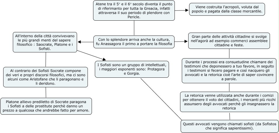 Questa Cmap, creata con IHMC CmapTools, contiene informazioni relative a: Atene e la filosofia, Con lo splendore arriva anche la cultura, fu Anassagora il primo a portare la filosofia ???? Gran parte delle attività cittadine si svolge nell'agorà ad esempio commerci assemblee cittadine e feste., All'interno della città convivevano le più grandi menti del sapere filosofico : Saocrate, Platone e i Sofisti. ???? Al contrario dei Sofisti Socrate compone dei veri e propri discorsi filosofici, ma ci sono alcuni come Aristofane che li paragonano e li deridono., Gran parte delle attività cittadine si svolge nell'agorà ad esempio commerci assemblee cittadine e feste. ???? Durante i processi era consuetudine chiamare dei testimoni che deponessero a tuo favore, in seguito i testimoni si fecero pagare e così nacquero gli avvocati e la retorica cioè l'arte di saper covincere a parole., Durante i processi era consuetudine chiamare dei testimoni che deponessero a tuo favore, in seguito i testimoni si fecero pagare e così nacquero gli avvocati e la retorica cioè l'arte di saper covincere a parole. ???? La retorica venne utilizzata anche durante i comizi per ottenere il voto dei cittadini, i mercanti più ricchi assunsero degli avvocati perchè gli insegnassero la retorica, Atene tra il 5° e il 6° secolo diventa il punto di riferimanto per tutta la Greacia, infatti attraversa il suo periodo di plendore con Pericle. ???? Viene costruita l'acropoli, voluta dal popolo e pagata dalla classe mercantile., La retorica venne utilizzata anche durante i comizi per ottenere il voto dei cittadini, i mercanti più ricchi assunsero degli avvocati perchè gli insegnassero la retorica ???? Questi avvocati vengono chiamati sofisti (da Sofistos che significa sapientissimi)., Con lo splendore arriva anche la cultura, fu Anassagora il primo a portare la filosofia ???? All'interno della città convivevano le più grandi menti del sapere filosofico : Saocrate, Platone e i Sofisti., Atene tra il 5° e il 6° secolo diventa il punto di riferimanto per tutta la Greacia, infatti attraversa il suo periodo di plendore con Pericle. ???? Con lo splendore arriva anche la cultura, fu Anassagora il primo a portare la filosofia, Al contrario dei Sofisti Socrate compone dei veri e propri discorsi filosofici, ma ci sono alcuni come Aristofane che li paragonano e li deridono. ???? Platone allievo prediletto di Socrate paragona i Sofisti a delle prostitute perchè danno un prezzo a qualcosa che andrebbe fatto per amore., All'interno della città convivevano le più grandi menti del sapere filosofico : Saocrate, Platone e i Sofisti. ???? I Sofisti sono un gruppo di intellettuali, i maggiori esponenti sono: Protagora e Gorgia., I Sofisti sono un gruppo di intellettuali, i maggiori esponenti sono: Protagora e Gorgia. ???? Questi avvocati vengono chiamati sofisti (da Sofistos che significa sapientissimi).