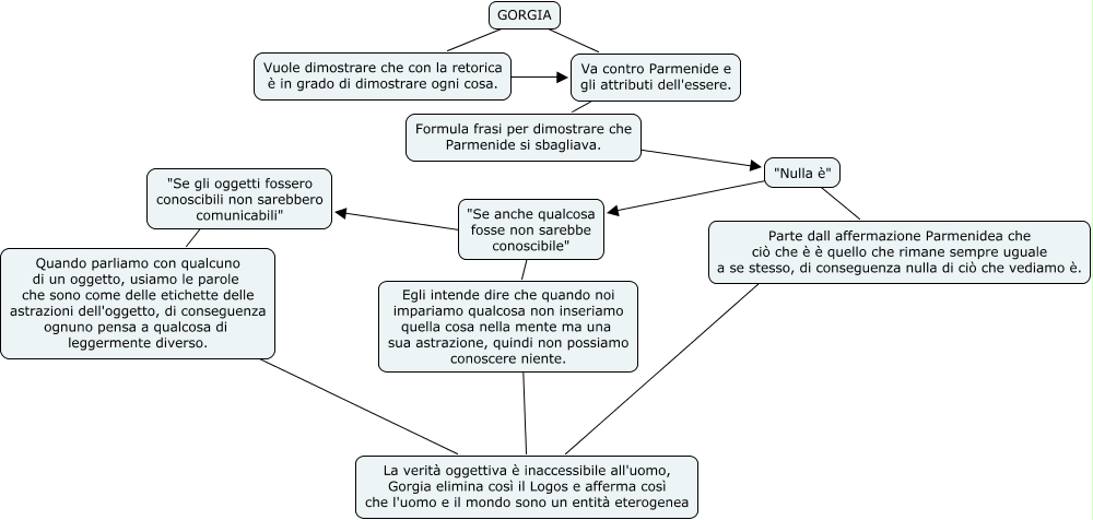 Questa Cmap, creata con IHMC CmapTools, contiene informazioni relative a: Gorgia, "Nulla è" ???? "Se anche qualcosa fosse non sarebbe conoscibile", GORGIA ???? Vuole dimostrare che con la retorica è in grado di dimostrare ogni cosa., "Se anche qualcosa fosse non sarebbe conoscibile" ???? "Se gli oggetti fossero conoscibili non sarebbero comunicabili", Vuole dimostrare che con la retorica è in grado di dimostrare ogni cosa. ???? Va contro Parmenide e gli attributi dell'essere., "Se anche qualcosa fosse non sarebbe conoscibile" ???? Egli intende dire che quando noi impariamo qualcosa non inseriamo quella cosa nella mente ma una sua astrazione, quindi non possiamo conoscere niente., GORGIA ???? Va contro Parmenide e gli attributi dell'essere., Formula frasi per dimostrare che Parmenide si sbagliava. ???? "Nulla è", Va contro Parmenide e gli attributi dell'essere. ???? Formula frasi per dimostrare che Parmenide si sbagliava., Quando parliamo con qualcuno di un oggetto, usiamo le parole che sono come delle etichette delle astrazioni dell'oggetto, di conseguenza ognuno pensa a qualcosa di leggermente diverso. ???? La verità oggettiva è inaccessibile all'uomo, Gorgia elimina così il Logos e afferma così che l'uomo e il mondo sono un entità eterogenea, Parte dall affermazione Parmenidea che ciò che è è quello che rimane sempre uguale a se stesso, di conseguenza nulla di ciò che vediamo è. ???? La verità oggettiva è inaccessibile all'uomo, Gorgia elimina così il Logos e afferma così che l'uomo e il mondo sono un entità eterogenea, "Nulla è" ???? Parte dall affermazione Parmenidea che ciò che è è quello che rimane sempre uguale a se stesso, di conseguenza nulla di ciò che vediamo è., "Se gli oggetti fossero conoscibili non sarebbero comunicabili" ???? Quando parliamo con qualcuno di un oggetto, usiamo le parole che sono come delle etichette delle astrazioni dell'oggetto, di conseguenza ognuno pensa a qualcosa di leggermente diverso., Egli intende dire che quando noi impariamo qualcosa non inseriamo quella cosa nella mente ma una sua astrazione, quindi non possiamo conoscere niente. ???? La verità oggettiva è inaccessibile all'uomo, Gorgia elimina così il Logos e afferma così che l'uomo e il mondo sono un entità eterogenea