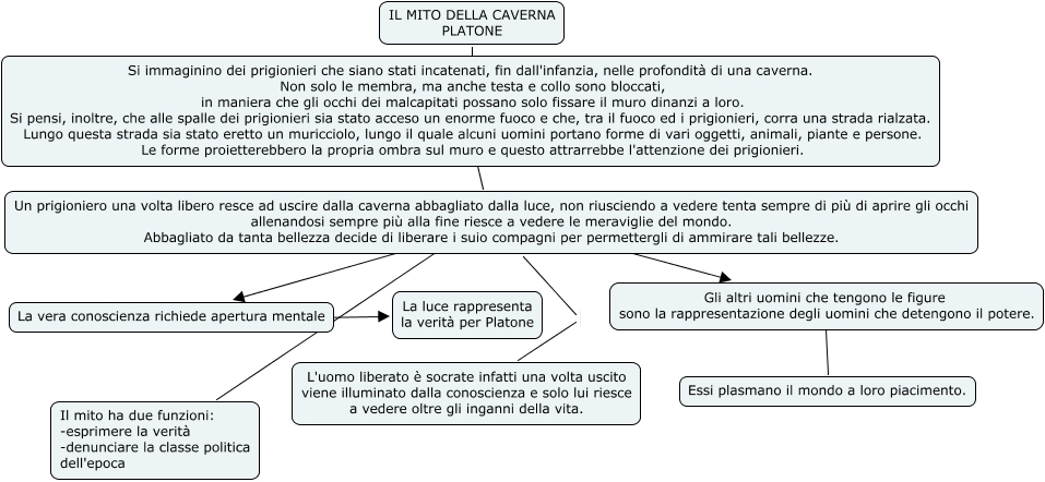 Questa Cmap, creata con IHMC CmapTools, contiene informazioni relative a: Il mito della caverna, Si immaginino dei prigionieri che siano stati incatenati, fin dall'infanzia, nelle profondità di una caverna. Non solo le membra, ma anche testa e collo sono bloccati, in maniera che gli occhi dei malcapitati possano solo fissare il muro dinanzi a loro. Si pensi, inoltre, che alle spalle dei prigionieri sia stato acceso un enorme fuoco e che, tra il fuoco ed i prigionieri, corra una strada rialzata. Lungo questa strada sia stato eretto un muricciolo, lungo il quale alcuni uomini portano forme di vari oggetti, animali, piante e persone. Le forme proietterebbero la propria ombra sul muro e questo attrarrebbe l'attenzione dei prigionieri. ???? Un prigioniero una volta libero resce ad uscire dalla caverna abbagliato dalla luce, non riusciendo a vedere tenta sempre di più di aprire gli occhi allenandosi sempre più alla fine riesce a vedere le meraviglie del mondo. Abbagliato da tanta bellezza decide di liberare i suio compagni per permettergli di ammirare tali bellezze., IL MITO DELLA CAVERNA PLATONE ???? Si immaginino dei prigionieri che siano stati incatenati, fin dall'infanzia, nelle profondità di una caverna. Non solo le membra, ma anche testa e collo sono bloccati, in maniera che gli occhi dei malcapitati possano solo fissare il muro dinanzi a loro. Si pensi, inoltre, che alle spalle dei prigionieri sia stato acceso un enorme fuoco e che, tra il fuoco ed i prigionieri, corra una strada rialzata. Lungo questa strada sia stato eretto un muricciolo, lungo il quale alcuni uomini portano forme di vari oggetti, animali, piante e persone. Le forme proietterebbero la propria ombra sul muro e questo attrarrebbe l'attenzione dei prigionieri., Un prigioniero una volta libero resce ad uscire dalla caverna abbagliato dalla luce, non riusciendo a vedere tenta sempre di più di aprire gli occhi allenandosi sempre più alla fine riesce a vedere le meraviglie del mondo. Abbagliato da tanta bellezza decide di liberare i suio compagni per permettergli di ammirare tali bellezze. L'uomo liberato è socrate infatti una volta uscito viene illuminato dalla conoscienza e solo lui riesce a vedere oltre gli inganni della vita., Un prigioniero una volta libero resce ad uscire dalla caverna abbagliato dalla luce, non riusciendo a vedere tenta sempre di più di aprire gli occhi allenandosi sempre più alla fine riesce a vedere le meraviglie del mondo. Abbagliato da tanta bellezza decide di liberare i suio compagni per permettergli di ammirare tali bellezze. ???? La vera conoscienza richiede apertura mentale, Un prigioniero una volta libero resce ad uscire dalla caverna abbagliato dalla luce, non riusciendo a vedere tenta sempre di più di aprire gli occhi allenandosi sempre più alla fine riesce a vedere le meraviglie del mondo. Abbagliato da tanta bellezza decide di liberare i suio compagni per permettergli di ammirare tali bellezze. ???? Il mito ha due funzioni: -esprimere la verità -denunciare la classe politica dell'epoca, La vera conoscienza richiede apertura mentale ???? La luce rappresenta la verità per Platone, Un prigioniero una volta libero resce ad uscire dalla caverna abbagliato dalla luce, non riusciendo a vedere tenta sempre di più di aprire gli occhi allenandosi sempre più alla fine riesce a vedere le meraviglie del mondo. Abbagliato da tanta bellezza decide di liberare i suio compagni per permettergli di ammirare tali bellezze. ???? Gli altri uomini che tengono le figure sono la rappresentazione degli uomini che detengono il potere., Gli altri uomini che tengono le figure sono la rappresentazione degli uomini che detengono il potere. ???? Essi plasmano il mondo a loro piacimento.
