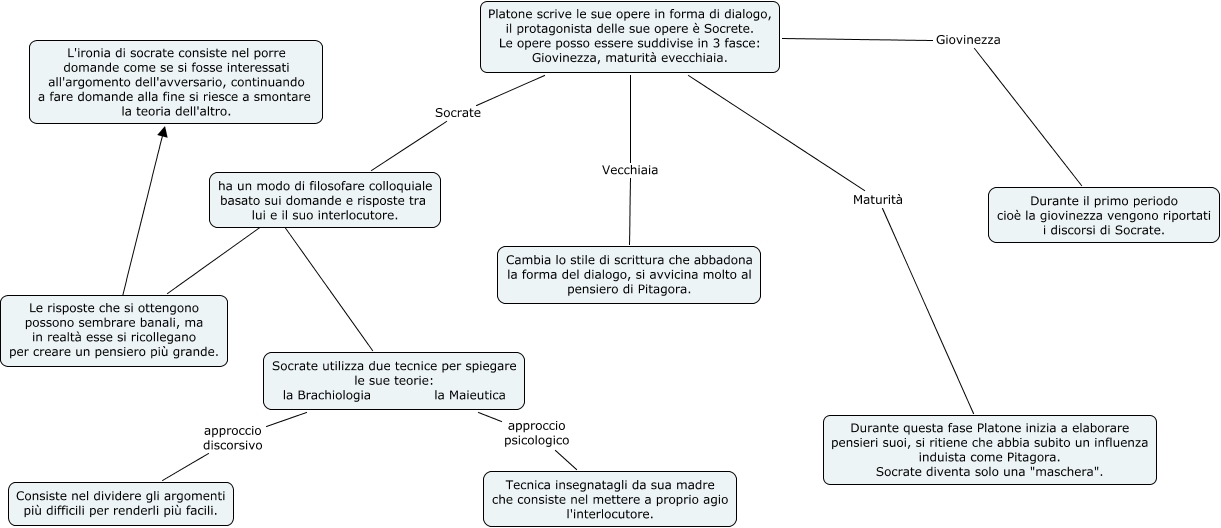 Questa Cmap, creata con IHMC CmapTools, contiene informazioni relative a: Platone e Socrate, Platone scrive le sue opere in forma di dialogo, il protagonista delle sue opere è Socrete. Le opere posso essere suddivise in 3 fasce: Giovinezza, maturità evecchiaia. Socrate ha un modo di filosofare colloquiale basato sui domande e risposte tra lui e il suo interlocutore., Platone scrive le sue opere in forma di dialogo, il protagonista delle sue opere è Socrete. Le opere posso essere suddivise in 3 fasce: Giovinezza, maturità evecchiaia. Vecchiaia Cambia lo stile di scrittura che abbadona la forma del dialogo, si avvicina molto al pensiero di Pitagora., ha un modo di filosofare colloquiale basato sui domande e risposte tra lui e il suo interlocutore. ???? Socrate utilizza due tecnice per spiegare le sue teorie: la Brachiologia la Maieutica, ha un modo di filosofare colloquiale basato sui domande e risposte tra lui e il suo interlocutore. ???? Le risposte che si ottengono possono sembrare banali, ma in realtà esse si ricollegano per creare un pensiero più grande., Socrate utilizza due tecnice per spiegare le sue teorie: la Brachiologia la Maieutica approccio discorsivo Consiste nel dividere gli argomenti più difficili per renderli più facili., Platone scrive le sue opere in forma di dialogo, il protagonista delle sue opere è Socrete. Le opere posso essere suddivise in 3 fasce: Giovinezza, maturità evecchiaia. Maturità Durante questa fase Platone inizia a elaborare pensieri suoi, si ritiene che abbia subito un influenza induista come Pitagora. Socrate diventa solo una "maschera"., Socrate utilizza due tecnice per spiegare le sue teorie: la Brachiologia la Maieutica approccio psicologico Tecnica insegnatagli da sua madre che consiste nel mettere a proprio agio l'interlocutore., Platone scrive le sue opere in forma di dialogo, il protagonista delle sue opere è Socrete. Le opere posso essere suddivise in 3 fasce: Giovinezza, maturità evecchiaia. Giovinezza Durante il primo periodo cioè la giovinezza vengono riportati i discorsi di Socrate., Le risposte che si ottengono possono sembrare banali, ma in realtà esse si ricollegano per creare un pensiero più grande. ???? L'ironia di socrate consiste nel porre domande come se si fosse interessati all'argomento dell'avversario, continuando a fare domande alla fine si riesce a smontare la teoria dell'altro.