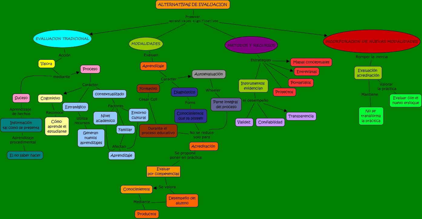 Este Cmap, tiene información relacionada con: ALTERNATIVAS EN LA EVALUACION, MODALIDADES Evaluan Aprendizaje, contextualizado Factores Familiar, ALTERNATIVAS DE EVALUACION Promover aprendizajes significativos METODOS Y RECURSOS, Nivel academico Afectan Aprendizaje, Proceso Carácter contextualizado, Evaluar por competencias Se valora Desempeño del alumno, ALTERNATIVAS DE EVALUACION Promover aprendizajes significativos INCORPORACION DE NUEVAS MODALIDADES, Valora mediante Suceso, Diagnóstico Forns Conocimientos que ya poseen, Acreditación Se propone poner en práctica Evaluar por competencias, Parte integral del proceso No se reduce solo para Acreditación, METODOS Y RECURSOS Estrategias Instrumentos evidencian, Aprendizaje Caracter Autoevaluación, Formativo Cesar Coll Durante el proceso educativo, Durante el proceso educativo No se reduce solo para Acreditación, ALTERNATIVAS DE EVALUACION Promover aprendizajes significativos MODALIDADES, Instrumentos evidencian el desempeño Confiabilidad, METODOS Y RECURSOS Estrategias Portafolios, METODOS Y RECURSOS Estrategias Entrevistas, contextualizado Factores Nivel academico