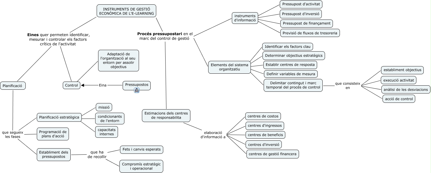 Aquest mapa conceptual conté informació relacionada amb: Instruments Gestió Económica (gestió i sistemes), Planificació que segueix les fases Programació de plans d'acció, Planificació que segueix les fases Establiment dels pressupostos, Elements del sistema organitzatiu ???? Determinar objectius estratègics, Planificació que segueix les fases Planificació estratègica, Pressupostos Eina Control, Elements del sistema organitzatiu ???? Delimitar contingut i marc temporal del procés de control, Planificació estratègica ???? condicionants de l'entorn, Planificació estratègica ???? capacitats internes, Estimacions dels centres de responsabilita elaboració d'informació a centres d'ingressos, instruments d'informació ? Pressupost d'inversió, Estimacions dels centres de responsabilita elaboració d'informació a centres de beneficis, INSTRUMENTS DE GESTIÓ ECONÒMICA DE L'E-LEARNING Procés pressupostari en el marc del control de gestió Elements del sistema organitzatiu, INSTRUMENTS DE GESTIÓ ECONÒMICA DE L'E-LEARNING Eines quer permeten identificar, mesurar i controlar els factors crítics de l'activitat Control, Estimacions dels centres de responsabilita elaboració d'informació a centres de gestió financera, Delimitar contingut i marc temporal del procés de control que consisteix en execució activitat, instruments d'informació ? Pressupost de finançament, instruments d'informació ? Pressupost d'activitat, Establiment dels pressupostos que ha de recollir Fets i canvis esperats, Elements del sistema organitzatiu ???? Definir variables de mesura, Estimacions dels centres de responsabilita elaboració d'informació a centres d'inversió