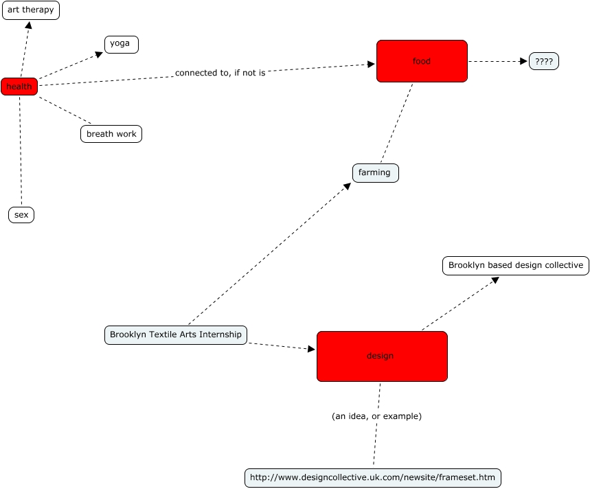This Concept Map, created with IHMC CmapTools, has information related to: nicole, Brooklyn Textile Arts Internship farming, health breath work, food ????, design Brooklyn based design collective, Brooklyn Textile Arts Internship design, health sex, design (an idea, or example) http://www.designcollective.uk.com/newsite/frameset.htm, food farming, health art therapy, health connected to, if not is food, health yoga