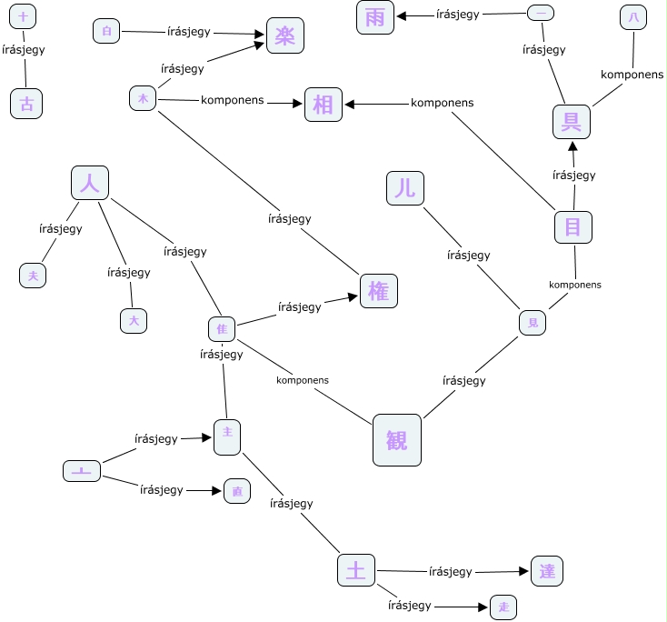 This Concept Map, created with IHMC CmapTools, has information related to: 4. csoport, 八 komponens 具, 目 írásjegy 具, 亠 írásjegy 直, 一 írásjegy 具, 人 írásjegy 隹, 土 írásjegy 走, 見 írásjegy 観, 目 komponens 見, 一 írásjegy 雨, 白 írásjegy 楽, 木 írásjegy 楽, 主 írásjegy 土, 儿 írásjegy 見, 土 írásjegy 達, 人 írásjegy 夫, 十 írásjegy 古, 亠 írásjegy 主, 目 komponens 相, 隹 írásjegy 権, 木 komponens 相