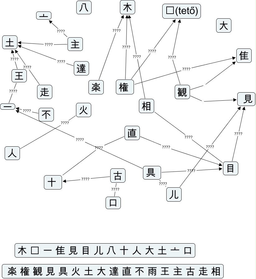 This Concept Map, created with IHMC CmapTools, has information related to: 5.csoport, 具 ???? 儿, 儿 ???? 見, 直 ???? 目, 目 ???? 見, 楽 ???? 木, 古 ???? 十, 古 ???? 口, 権 ???? 𠂉(tető), 具 ???? 目, 主 ???? 土, 相 ???? 木, 相 ???? 目, 観 見, 火 ???? 人, 王 ???? 一, 観 ???? 𠂉(tető), 権 ???? 隹, 主 ???? 亠, 達 ???? 土, 権 ???? 木