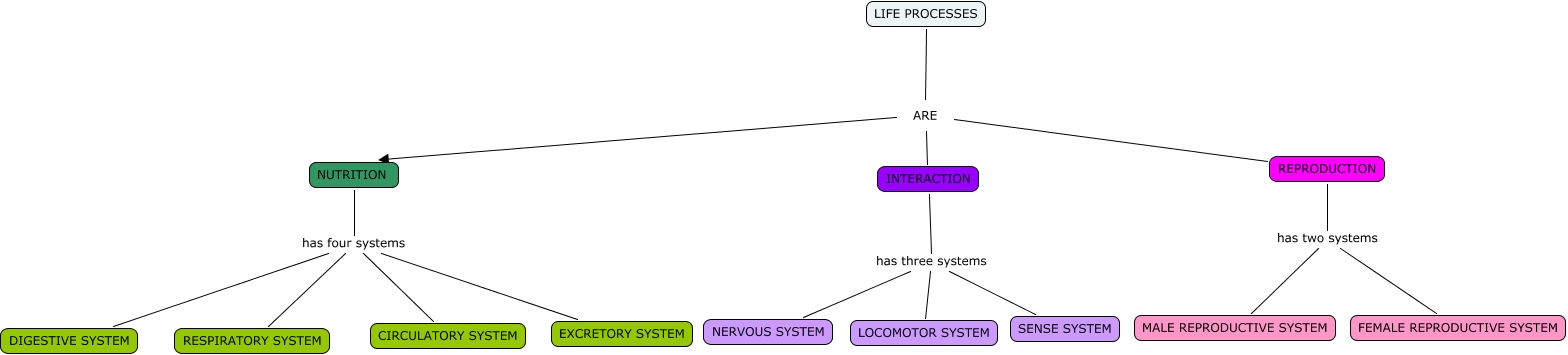Este Cmap, tiene información relacionada con: LIFE PROCESSES AND THEIR SYSTEMS, LIFE PROCESSES ARE REPRODUCTION, LIFE PROCESSES ARE NUTRITION, INTERACTION has three systems LOCOMOTOR SYSTEM, INTERACTION has three systems SENSE SYSTEM, NUTRITION has four systems RESPIRATORY SYSTEM, INTERACTION has three systems NERVOUS SYSTEM, REPRODUCTION has two systems MALE REPRODUCTIVE SYSTEM, NUTRITION has four systems EXCRETORY SYSTEM, NUTRITION has four systems CIRCULATORY SYSTEM, NUTRITION has four systems DIGESTIVE SYSTEM, LIFE PROCESSES ARE INTERACTION, REPRODUCTION has two systems FEMALE REPRODUCTIVE SYSTEM