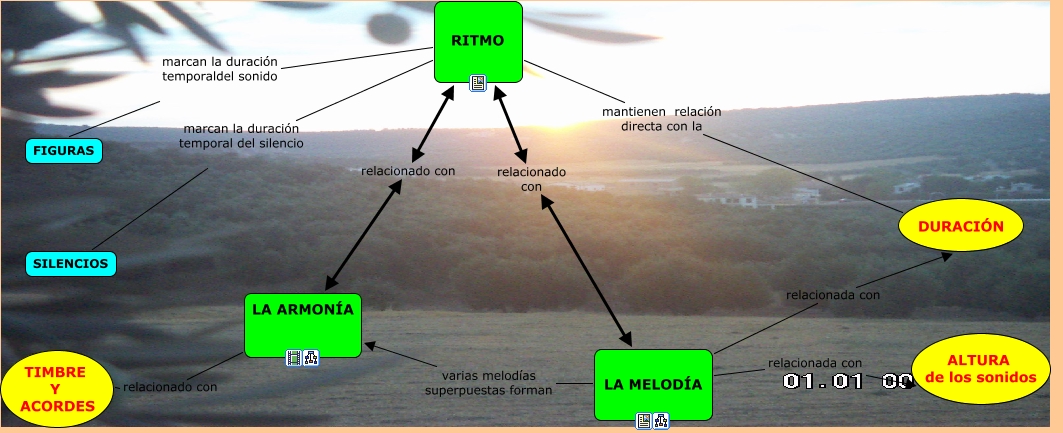 Este Cmap, tiene información relacionada con: ACTIVIDAD PACO ARJONA, RITMO relacionado con LA ARMONÍA, RITMO relacionado con LA MELODÍA, LA MELODÍA relacionada con DURACIÓN, RITMO mantienen relación directa con la DURACIÓN, LA MELODÍA varias melodías superpuestas forman LA ARMONÍA, RITMO marcan la duración temporaldel sonido FIGURAS, LA MELODÍA relacionada con ALTURA de los sonidos, RITMO marcan la duración temporal del silencio SILENCIOS, LA ARMONÍA relacionado con TIMBRE Y ACORDES