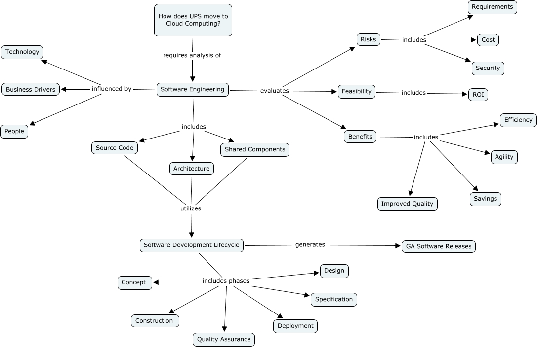This Concept Map, created with IHMC CmapTools, has information related to: LShannon_SWEng1, Benefits includes Efficiency, Software Development Lifecycle generates GA Software Releases, Architecture utilizes Software Development Lifecycle, Software Engineering includes Architecture, How does UPS move to Cloud Computing? requires analysis of Software Engineering, Risks includes Security, Benefits includes Agility, Software Development Lifecycle includes phases Specification, Software Engineering influenced by Technology, Software Development Lifecycle includes phases Construction, Software Development Lifecycle includes phases Quality Assurance, Software Development Lifecycle includes phases Concept, Shared Components utilizes Software Development Lifecycle, Software Engineering influenced by Business Drivers, Software Development Lifecycle includes phases Design, Software Engineering evaluates Benefits, Risks includes Requirements, Feasibility includes ROI, Software Engineering influenced by People, Benefits includes Improved Quality