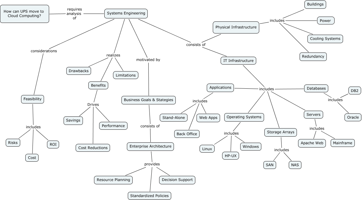 This Concept Map, created with IHMC CmapTools, has information related to: LShannon_SysEng2, IT Infrastructure includes Databases, Physical Infrastructure includes Power, Enterprise Architecture provides Standardized Policies, IT Infrastructure includes Servers, Systems Engineering realizes Limitations, Benefits Drives Savings, Physical Infrastructure includes Buildings, Systems Engineering realizes Drawbacks, Feasibility includes ROI, Systems Engineering motivated by Business Goals & Stategies, Benefits Drives Performance, Databases includes Oracle, Systems Engineering considerations Feasibility, Enterprise Architecture provides Resource Planning, Storage Arrays includes NAS, Operating Systems includes Windows, Servers includes Mainframe, Benefits Drives Cost Reductions, Databases includes DB2, Applications includes Back Office