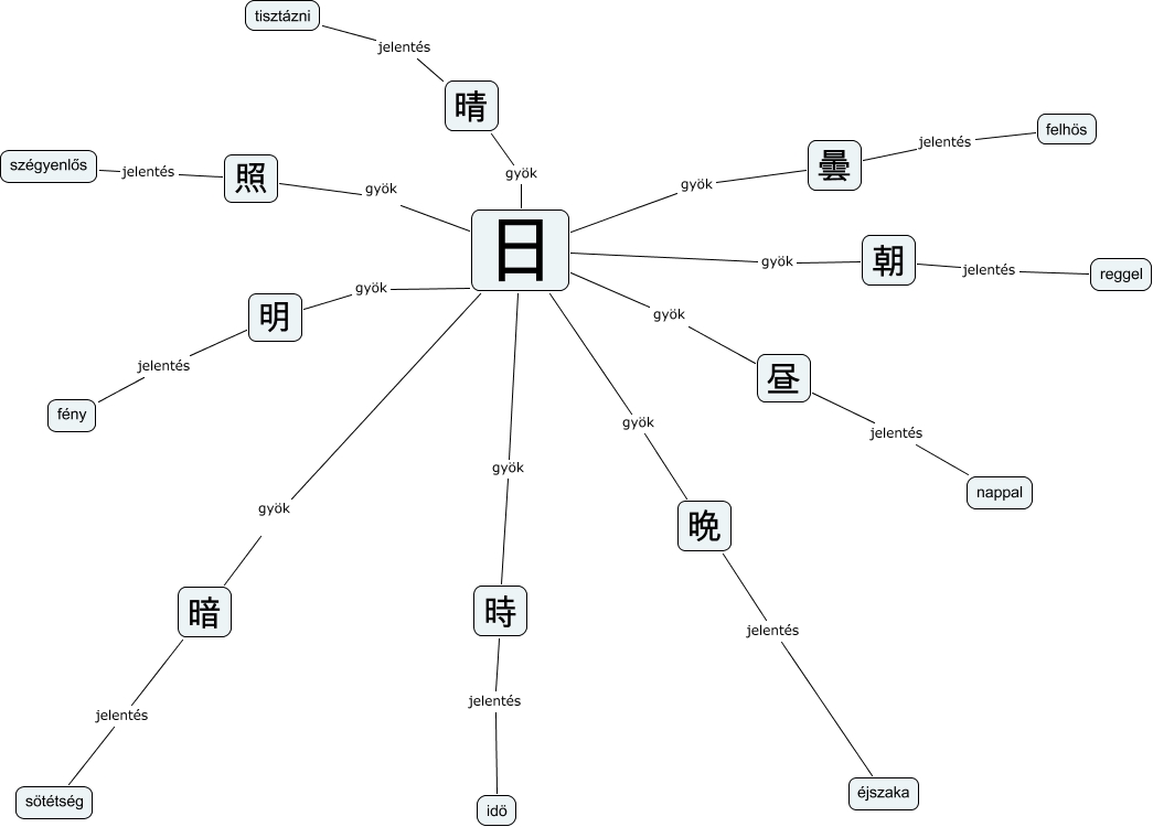 This Concept Map, created with IHMC CmapTools, has information related to: 1.csoport KD SzSz 120322, 曇 jelentés felhös, 日 gyök 晩, 明 jelentés fény, 日 gyök 時, 暗 jelentés sötétség, 時 jelentés idö, nappal jelentés 昼, reggel jelentés 朝, 照 jelentés szégyenlős, 晴 jelentés tisztázni, 日 gyök 曇, 日 gyök 昼, 日 gyök 朝, 日 gyök 明, 日 gyök 暗, 晩 jelentés éjszaka, 日 gyök 晴, 照 gyök 日