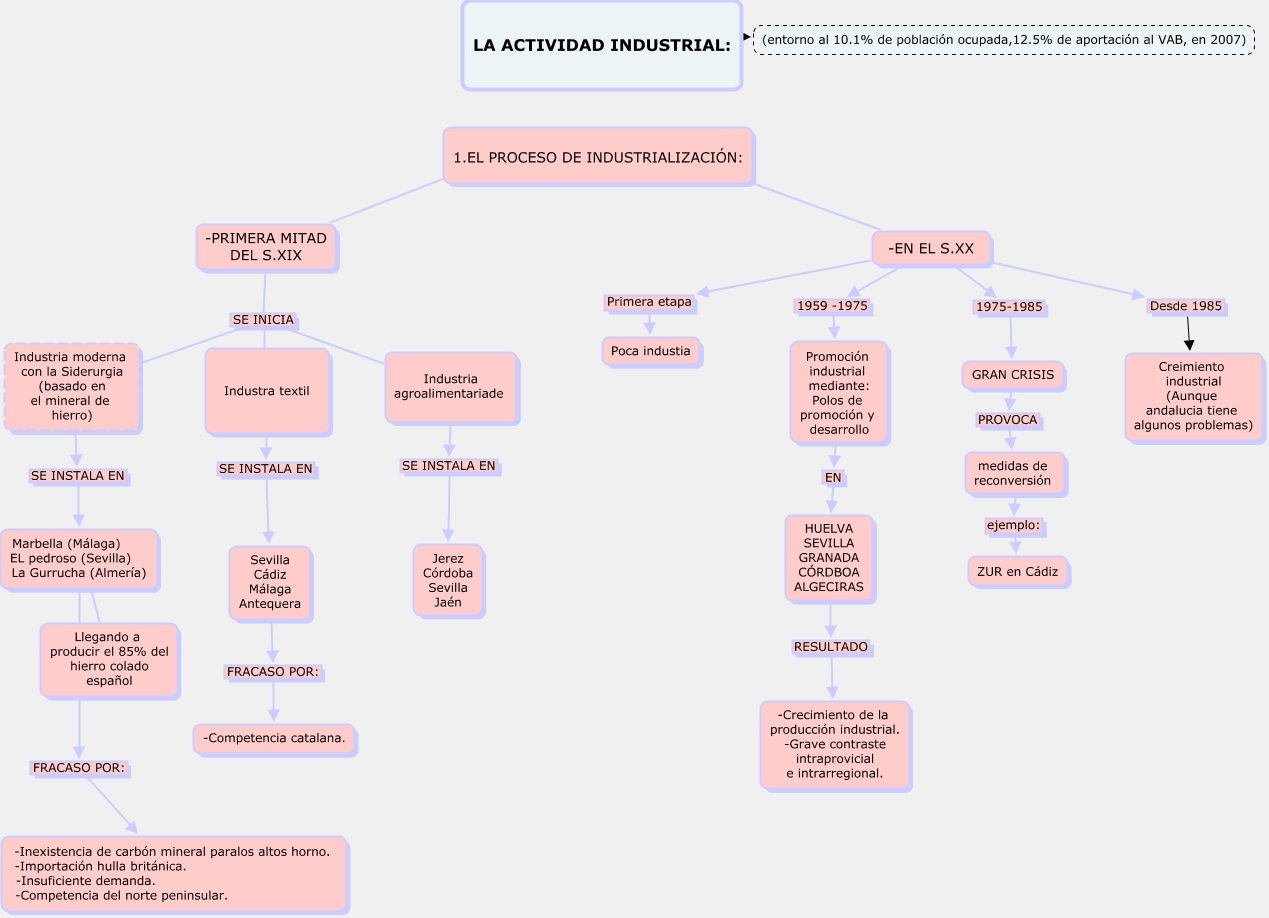 Este Cmap, tiene información relacionada con: geo, Llegando a producir el 85% del hierro colado español ???? Marbella (Málaga) EL pedroso (Sevilla) La Gurrucha (Almería), LA ACTIVIDAD INDUSTRIAL: ???? (entorno al 10.1% de población ocupada,12.5% de aportación al VAB, en 2007), -EN EL S.XX Primera etapa Poca industia, Industra textil SE INSTALA EN Sevilla Cádiz Málaga Antequera, 1.EL PROCESO DE INDUSTRIALIZACIÓN: ???? -PRIMERA MITAD DEL S.XIX, -EN EL S.XX 1959 -1975 Promoción industrial mediante: Polos de promoción y desarrollo, Industria agroalimentariade SE INSTALA EN Jerez Córdoba Sevilla Jaén, -PRIMERA MITAD DEL S.XIX SE INICIA Industria moderna con la Siderurgia (basado en el mineral de hierro), Industria moderna con la Siderurgia (basado en el mineral de hierro) SE INSTALA EN Marbella (Málaga) EL pedroso (Sevilla) La Gurrucha (Almería), medidas de reconversión ejemplo: ZUR en Cádiz, HUELVA SEVILLA GRANADA CÓRDBOA ALGECIRAS RESULTADO -Crecimiento de la producción industrial. -Grave contraste intraprovicial e intrarregional., -PRIMERA MITAD DEL S.XIX SE INICIA Industra textil, Promoción industrial mediante: Polos de promoción y desarrollo EN HUELVA SEVILLA GRANADA CÓRDBOA ALGECIRAS, GRAN CRISIS PROVOCA medidas de reconversión, -EN EL S.XX Desde 1985 Creimiento industrial (Aunque andalucia tiene algunos problemas), 1.EL PROCESO DE INDUSTRIALIZACIÓN: ???? -EN EL S.XX, Sevilla Cádiz Málaga Antequera FRACASO POR: -Competencia catalana., -EN EL S.XX 1975-1985 GRAN CRISIS, Marbella (Málaga) EL pedroso (Sevilla) La Gurrucha (Almería) FRACASO POR: -Inexistencia de carbón mineral paralos altos horno. -Importación hulla británica. -Insuficiente demanda. -Competencia del norte peninsular., -PRIMERA MITAD DEL S.XIX SE INICIA Industria agroalimentariade