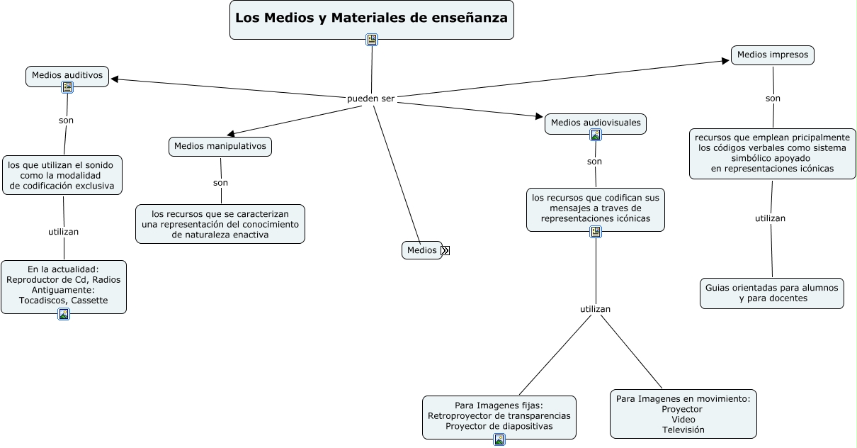 Este Cmap, tiene información relacionada con: Medios y Materiales de enseñanza, Medios audiovisuales son los recursos que codifican sus mensajes a traves de representaciones icónicas, Medios impresos son recursos que emplean pricipalmente los códigos verbales como sistema simbólico apoyado en representaciones icónicas, Los Medios y Materiales de enseñanza pueden ser Medios audiovisuales, Los Medios y Materiales de enseñanza pueden ser Medios manipulativos, Medios Digitales son los que posibilitan desarrollar, utilizar y combinar indistintamente cualquier modalidad de codificación simbólica de la información, Los Medios y Materiales de enseñanza pueden ser Medios Digitales, recursos que emplean pricipalmente los códigos verbales como sistema simbólico apoyado en representaciones icónicas utilizan Guias orientadas para alumnos y para docentes, Los Medios y Materiales de enseñanza pueden ser Medios auditivos, Los Medios y Materiales de enseñanza pueden ser Medios impresos, Medios manipulativos son los recursos que se caracterizan una representación del conocimiento de naturaleza enactiva, los recursos que codifican sus mensajes a traves de representaciones icónicas utilizan Para Imagenes fijas: Retroproyector de transparencias Proyector de diapositivas, Medios auditivos son los que utilizan el sonido como la modalidad de codificación exclusiva, los recursos que codifican sus mensajes a traves de representaciones icónicas utilizan Para Imagenes en movimiento: Proyector Video Televisión, los que posibilitan desarrollar, utilizar y combinar indistintamente cualquier modalidad de codificación simbólica de la información utilizan Computadora, Internet, los que utilizan el sonido como la modalidad de codificación exclusiva utilizan En la actualidad: Reproductor de Cd, Radios Antiguamente: Tocadiscos, Cassette