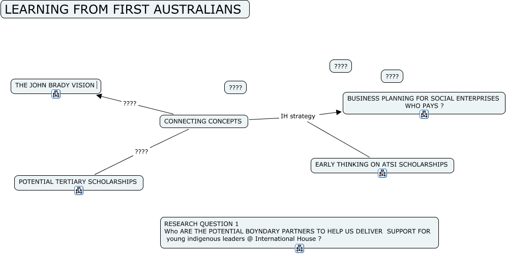 This Concept Map, created with IHMC CmapTools, has information related to: FIRST AUSTRALIANS CONNECTING CONCEPTS, CONNECTING CONCEPTS ???? POTENTIAL TERTIARY SCHOLARSHIPS, CONNECTING CONCEPTS IH strategy EARLY THINKING ON ATSI SCHOLARSHIPS, CONNECTING CONCEPTS IH strategy BUSINESS PLANNING FOR SOCIAL ENTERPRISES WHO PAYS ?, CONNECTING CONCEPTS ???? THE JOHN BRADY VISION