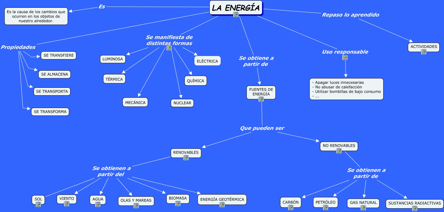 Este Cmap, tiene información relacionada con: La Energía, LA ENERGÍA Propiedades SE TRANSFORMA, FUENTES DE ENERGÍA Que pueden ser NO RENOVABLES, LA ENERGÍA Se manifiesta de distintas formas ELÉCTRICA, LA ENERGÍA Se manifiesta de distintas formas NUCLEAR, LA ENERGÍA Repaso lo aprendido ACTIVIDADES, RENOVABLES Se obtienen a partir del VIENTO, NO RENOVABLES Se obtienen a partir de SUSTANCIAS RADIACTIVAS, FUENTES DE ENERGÍA Que pueden ser RENOVABLES, LA ENERGÍA Se manifiesta de distintas formas LUMINOSA, NO RENOVABLES Se obtienen a partir de PETRÓLEO, LA ENERGÍA Se manifiesta de distintas formas TÉRMICA, LA ENERGÍA Es Es la causa de los cambios que ocurren en los objetos de nuestro alrededor., RENOVABLES Se obtienen a partir del BIOMASA, RENOVABLES Se obtienen a partir del SOL, LA ENERGÍA Uso responsable - Apagar luces innecesarias - No abusar de calefacción - Utilizar bombillas de bajo consumo - ..., RENOVABLES Se obtienen a partir del ENERGÍA GEOTÉRMICA, LA ENERGÍA Se manifiesta de distintas formas MECÁNICA, RENOVABLES Se obtienen a partir del AGUA, NO RENOVABLES Se obtienen a partir de GAS NATURAL, RENOVABLES Se obtienen a partir del OLAS Y MAREAS