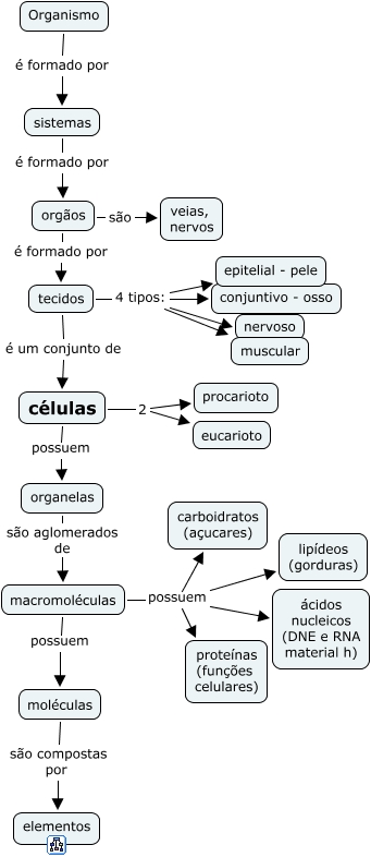 Esse mapa conceitual, produzido no IHMC CmapTools, tem a informação relacionada a: aula 1 - niveis de organização, sistemas é formado por orgãos, células 2 eucarioto, macromoléculas possuem lipídeos (gorduras), tecidos é um conjunto de células, células 2 procarioto, moléculas são compostas por elementos, organelas são aglomerados de macromoléculas, orgãos é formado por tecidos, tecidos 4 tipos: nervoso, tecidos 4 tipos: muscular, orgãos são veias, nervos, macromoléculas possuem proteínas (funções celulares), tecidos 4 tipos: conjuntivo - osso, células possuem organelas, Organismo é formado por sistemas, tecidos 4 tipos: epitelial - pele, macromoléculas possuem moléculas, macromoléculas possuem carboidratos (açucares), macromoléculas possuem ácidos nucleicos (DNE e RNA material h)
