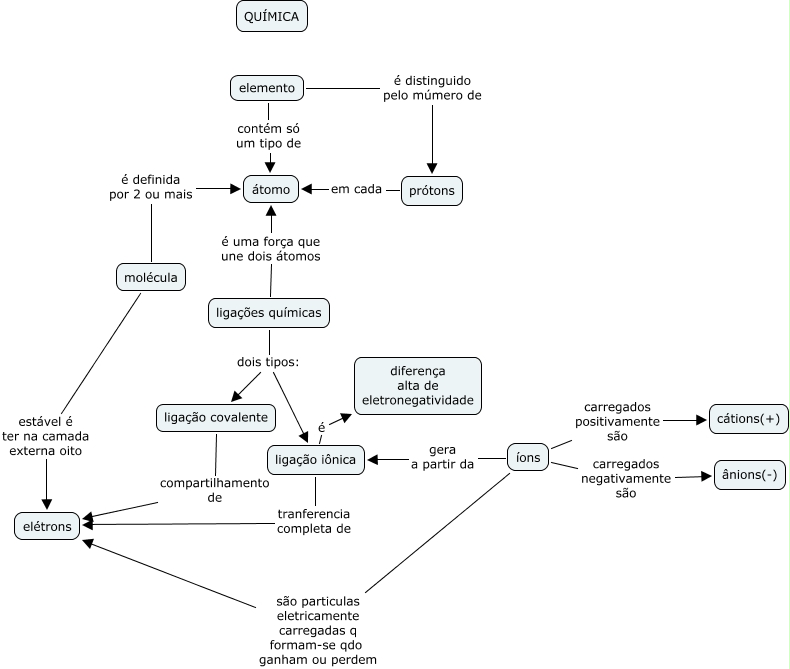 Esse mapa conceitual, produzido no IHMC CmapTools, tem a informação relacionada a: quimica 1, molécula estável é ter na camada externa oito elétrons, ligações químicas é uma força que une dois átomos átomo, íons gera a partir da ligação iônica, elemento é distinguido pelo múmero de prótons, íons carregados negativamente são ânions(-), ligações químicas dois tipos: ligação covalente, ligações químicas dois tipos: ligação iônica, elemento contém só um tipo de átomo, ligação covalente compartilhamento de elétrons, íons são particulas eletricamente carregadas q formam-se qdo ganham ou perdem elétrons, prótons em cada átomo, íons carregados positivamente são cátions(+), ligação iônica tranferencia completa de elétrons, ligação iônica é diferença alta de eletronegatividade, molécula é definida por 2 ou mais átomo