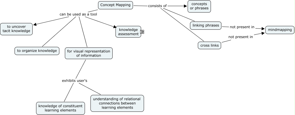 This Concept Map, created with IHMC CmapTools, has information related to: cmap recorder1, cross links not present in mindmapping, Concept Mapping consists of concepts or phrases, Concept Mapping consists of linking phrases, Concept Mapping can be used as a tool for visual representation of information, Concept Mapping consists of cross links, linking phrases not present in mindmapping, for visual representation of information exhibits user's knowledge of constituent learning elements, Concept Mapping can be used as a tool knowledge assessment, knowledge assessment can be quantitative, Concept Mapping can be used as a tool to uncover tacit knowledge, for visual representation of information exhibits user's understanding of relational connections between learning elements, knowledge assessment can be qualitative, Concept Mapping can be used as a tool to organize knowledge