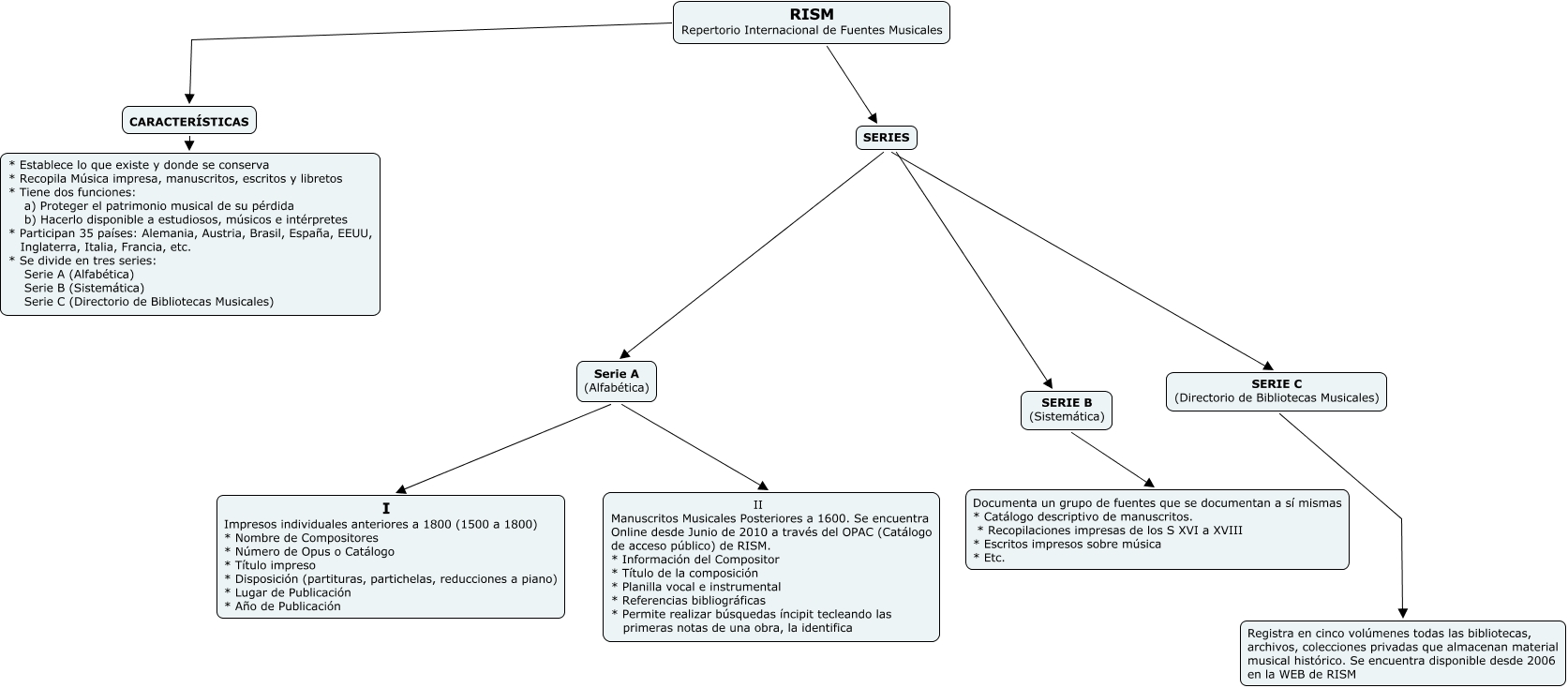 Este Cmap, tiene información relacionada con: RISM, SERIES Serie A (Alfabética), SERIE C (Directorio de Bibliotecas Musicales) Registra en cinco volúmenes todas las bibliotecas, archivos, colecciones privadas que almacenan material musical histórico. Se encuentra disponible desde 2006 en la WEB de RISM, SERIE B (Sistemática) Documenta un grupo de fuentes que se documentan a sí mismas * Catálogo descriptivo de manuscritos. * Recopilaciones impresas de los S XVI a XVIII * Escritos impresos sobre música * Etc., Serie A (Alfabética) II Manuscritos Musicales Posteriores a 1600. Se encuentra Online desde Junio de 2010 a través del OPAC (Catálogo de acceso público) de RISM. * Información del Compositor * Título de la composición * Planilla vocal e instrumental * Referencias bibliográficas * Permite realizar búsquedas íncipit tecleando las primeras notas de una obra, la identifica, RISM Repertorio Internacional de Fuentes Musicales SERIES, SERIES SERIE B (Sistemática), Serie A (Alfabética) I Impresos individuales anteriores a 1800 (1500 a 1800) * Nombre de Compositores * Número de Opus o Catálogo * Título impreso * Disposición (partituras, partichelas, reducciones a piano) * Lugar de Publicación * Año de Publicación, RISM Repertorio Internacional de Fuentes Musicales CARACTERÍSTICAS, SERIES SERIE C (Directorio de Bibliotecas Musicales), CARACTERÍSTICAS * Establece lo que existe y donde se conserva * Recopila Música impresa, manuscritos, escritos y libretos * Tiene dos funciones: a) Proteger el patrimonio musical de su pérdida b) Hacerlo disponible a estudiosos, músicos e intérpretes * Participan 35 países: Alemania, Austria, Brasil, España, EEUU, Inglaterra, Italia, Francia, etc. * Se divide en tres series: Serie A (Alfabética) Serie B (Sistemática) Serie C (Directorio de Bibliotecas Musicales)