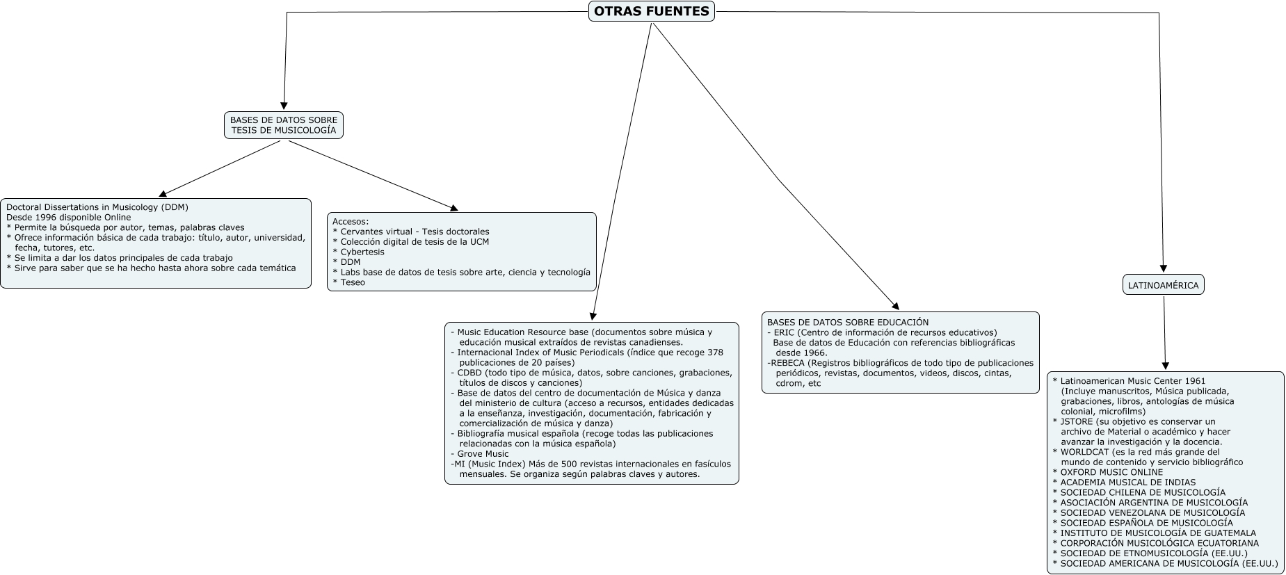 Este Cmap, tiene información relacionada con: Otras fuentes musicológicas, OTRAS FUENTES LATINOAMÉRICA, OTRAS FUENTES - Music Education Resource base (documentos sobre música y educación musical extraídos de revistas canadienses. - Internacional Index of Music Periodicals (índice que recoge 378 publicaciones de 20 países) - CDBD (todo tipo de música, datos, sobre canciones, grabaciones, títulos de discos y canciones) - Base de datos del centro de documentación de Música y danza del ministerio de cultura (acceso a recursos, entidades dedicadas a la enseñanza, investigación, documentación, fabricación y comercialización de música y danza) - Bibliografía musical española (recoge todas las publicaciones relacionadas con la música española) - Grove Music -MI (Music Index) Más de 500 revistas internacionales en fasículos mensuales. Se organiza según palabras claves y autores., BASES DE DATOS SOBRE TESIS DE MUSICOLOGÍA Accesos: * Cervantes virtual - Tesis doctorales * Colección digital de tesis de la UCM * Cybertesis * DDM * Labs base de datos de tesis sobre arte, ciencia y tecnología * Teseo, OTRAS FUENTES BASES DE DATOS SOBRE TESIS DE MUSICOLOGÍA, OTRAS FUENTES BASES DE DATOS SOBRE EDUCACIÓN - ERIC (Centro de información de recursos educativos) Base de datos de Educación con referencias bibliográficas desde 1966. -REBECA (Registros bibliográficos de todo tipo de publicaciones periódicos, revistas, documentos, videos, discos, cintas, cdrom, etc, LATINOAMÉRICA * Latinoamerican Music Center 1961 (Incluye manuscritos, Música publicada, grabaciones, libros, antologías de música colonial, microfilms) * JSTORE (su objetivo es conservar un archivo de Material o académico y hacer avanzar la investigación y la docencia. * WORLDCAT (es la red más grande del mundo de contenido y servicio bibliográfico * OXFORD MUSIC ONLINE * ACADEMIA MUSICAL DE INDIAS * SOCIEDAD CHILENA DE MUSICOLOGÍA * ASOCIACIÓN ARGENTINA DE MUSICOLOGÍA * SOCIEDAD VENEZOLANA DE MUSICOLOGÍA * SOCIEDAD ESPAÑOLA DE MUSICOLOGÍA * INSTITUTO DE MUSICOLOGÍA DE GUATEMALA * CORPORACIÓN MUSICOLÓGICA ECUATORIANA * SOCIEDAD DE ETNOMUSICOLOGÍA (EE.UU.) * SOCIEDAD AMERICANA DE MUSICOLOGÍA (EE.UU.), BASES DE DATOS SOBRE TESIS DE MUSICOLOGÍA Doctoral Dissertations in Musicology (DDM) Desde 1996 disponible Online * Permite la búsqueda por autor, temas, palabras claves * Ofrece información básica de cada trabajo: título, autor, universidad, fecha, tutores, etc. * Se limita a dar los datos principales de cada trabajo * Sirve para saber que se ha hecho hasta ahora sobre cada temática