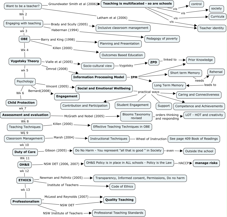 This Concept Map, created with IHMC CmapTools, has information related to: EDUC1005 outline, Duty of Care Wk 11 OH&S, Information Processing Model IPM Prior Knowledge, Psychology Vincent (2005) Social and Emotional Wellbeing, Instructional Techniques Wheel of Instruction See page 409 Book of Readings, OBE Killen (2000) Outcomes Based Education, Psychology Bernard(2008) Engagement, Social and Emotional Wellbeing practical ways Support, Psychology Wk 6 Child Protection, Vygotsky Theory Omrod (2008) Information Processing Model, Assessment and evaluation McGrath and Nobel (2005) Blooms Taxonomy revised, Teaching Techniques Wk 9 Classroom Management, OBE Wk 4 Vygotsky Theory, Teaching is multifaceted - so are schools vis Curricula, ETHICS Institute of Teachers Code of Ethics, OH&S wk 12 ETHICS, Engaging with teaching Haberman (1994) Pedagogy of poverty, Assessment and evaluation Wk 8 Teaching Techniques, ETHICS Newman and Pollnitz (2005) Transparency, Informed consent, Permissions, Do no harm, Socio-cultural view Vygotsky ZPD, Engaging with teaching Brady and Scully (2005) Inclusive classroom management