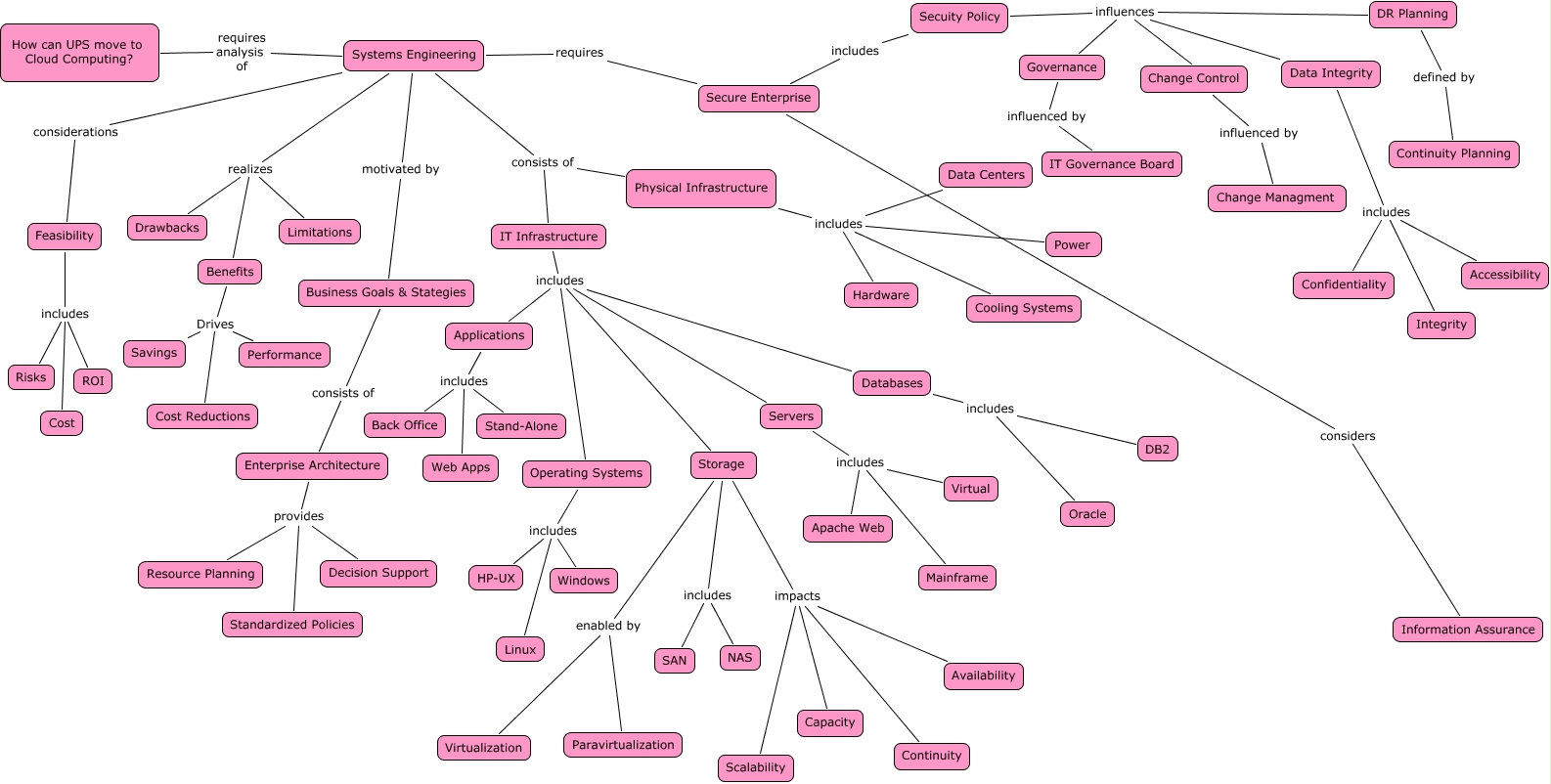 This Concept Map, created with IHMC CmapTools, has information related to: LShannon_SysEng3, Data Integrity includes Integrity, IT Infrastructure includes Databases, Physical Infrastructure includes Power, Enterprise Architecture provides Standardized Policies, IT Infrastructure includes Servers, Systems Engineering realizes Limitations, Benefits Drives Savings, DR Planning defined by Continuity Planning, Storage impacts Capacity, Change Control influenced by Change Managment, Physical Infrastructure includes Data Centers, Systems Engineering realizes Drawbacks, Feasibility includes ROI, Systems Engineering motivated by Business Goals & Stategies, Benefits Drives Performance, Secuity Policy influences Change Control, Databases includes Oracle, Systems Engineering considerations Feasibility, Enterprise Architecture provides Resource Planning, Storage includes NAS