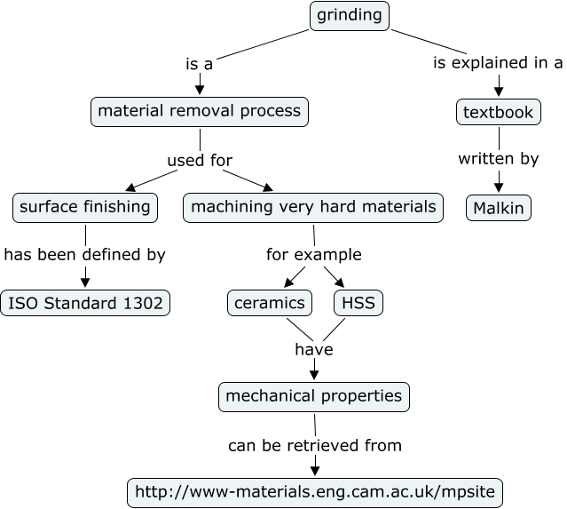 This Concept Map, created with IHMC CmapTools, has information related to: internet_cirp_figure_1, material removal process used for surface finishing, grinding is a material removal process, machining very hard materials for example HSS, textbook written by Malkin, machining very hard materials for example ceramics, HSS have mechanical properties, surface finishing has been defined by ISO Standard 1302, material removal process used for machining very hard materials, ceramics have mechanical properties, grinding is explained in a textbook, mechanical properties can be retrieved from http://www-materials.eng.cam.ac.uk/mpsite