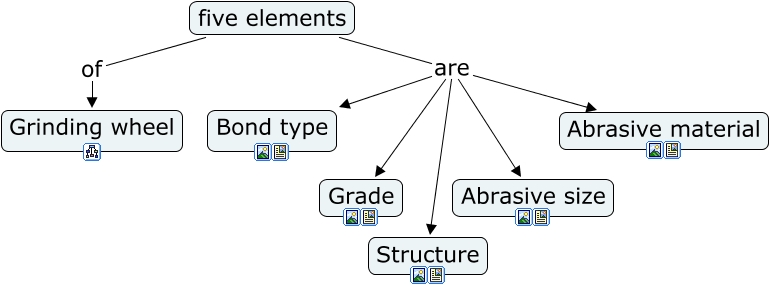 This Concept Map, created with IHMC CmapTools, has information related to: five elements, five elements are Abrasive size, five elements are Bond type, five elements are Grade, five elements are Abrasive material, five elements of Grinding wheel, five elements are Structure