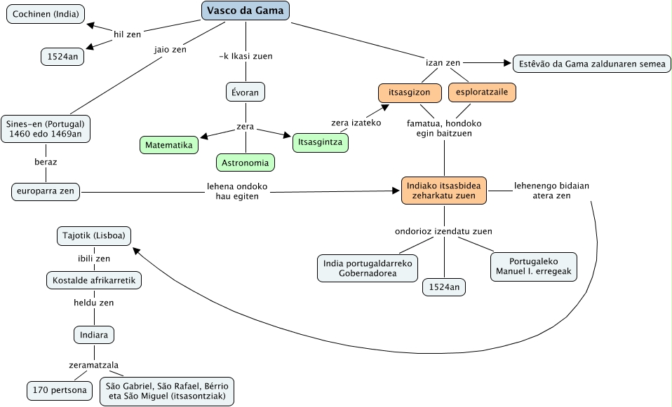 This Concept Map, created with IHMC CmapTools, has information related to: Vasco da Gama, Vasco da Gama izan zen esploratzaile, Vasco da Gama hil zen Cochinen (India), Vasco da Gama hil zen 1524an, Évoran zera Itsasgintza, itsasgizon famatua, hondoko egin baitzuen Indiako itsasbidea zeharkatu zuen, Itsasgintza zera izateko itsasgizon, Vasco da Gama izan zen Estêvão da Gama zaldunaren semea, europarra zen lehena ondoko hau egiten Indiako itsasbidea zeharkatu zuen, Indiako itsasbidea zeharkatu zuen ondorioz izendatu zuen India portugaldarreko Gobernadorea, Sines-en (Portugal) 1460 edo 1469an beraz europarra zen, Vasco da Gama -k Ikasi zuen Évoran, Indiako itsasbidea zeharkatu zuen lehenengo bidaian atera zen Tajotik (Lisboa), Indiara zeramatzala São Gabriel, São Rafael, Bérrio eta São Miguel (itsasontziak), Vasco da Gama jaio zen Sines-en (Portugal) 1460 edo 1469an, Évoran zera Astronomia, Tajotik (Lisboa) ibili zen Kostalde afrikarretik, esploratzaile famatua, hondoko egin baitzuen Indiako itsasbidea zeharkatu zuen, Indiako itsasbidea zeharkatu zuen ondorioz izendatu zuen Portugaleko Manuel I. erregeak, Indiako itsasbidea zeharkatu zuen ondorioz izendatu zuen 1524an, Kostalde afrikarretik heldu zen Indiara