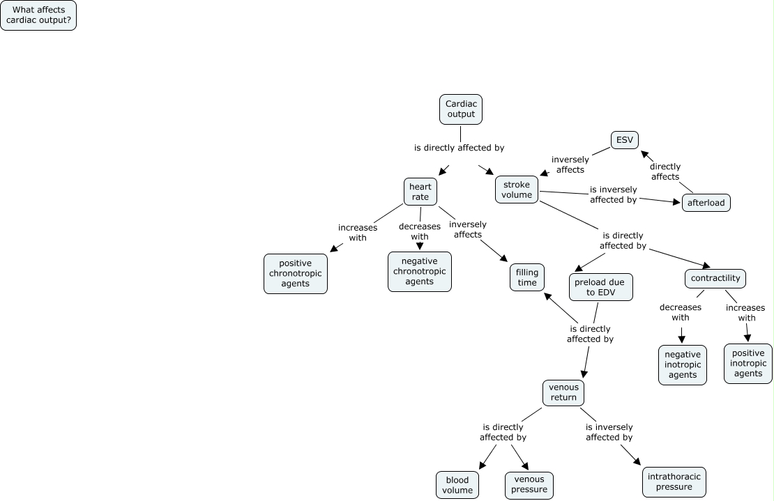 This Concept Map, created with IHMC CmapTools, has information related to: SandipPatelTutorial, Cardiac output is directly affected by stroke volume, venous return is directly affected by blood volume, afterload directly affects ESV, heart rate decreases with negative chronotropic agents, stroke volume is directly affected by preload due to EDV, preload due to EDV is directly affected by venous return, contractility increases with positive inotropic agents, Cardiac output is directly affected by heart rate, preload due to EDV is directly affected by filling time, stroke volume is inversely affected by afterload, heart rate increases with positive chronotropic agents, contractility decreases with negative inotropic agents, heart rate inversely affects filling time, stroke volume is directly affected by contractility, venous return is directly affected by venous pressure, venous return is inversely affected by intrathoracic pressure, ESV inversely affects stroke volume