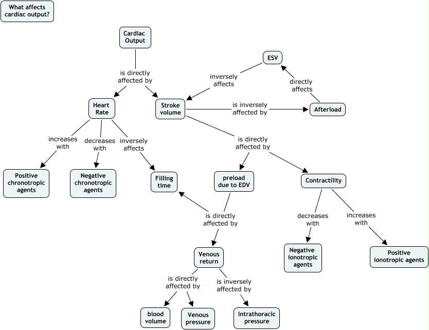 This Concept Map, created with IHMC CmapTools, has information related to: MichelleCrankTutorial, Stroke volume is directly affected by Contractility, Venous return is directly affected by Venous pressure, preload due to EDV is directly affected by Venous return, Cardiac Output is directly affected by Stroke volume, ESV inversely affects Stroke volume, Stroke volume is directly affected by preload due to EDV, Stroke volume is inversely affected by Afterload, Heart Rate decreases with Negative chronotropic agents, Cardiac Output is directly affected by Heart Rate, preload due to EDV is directly affected by Filling time, Contractility decreases with Negative ionotropic agents, Heart Rate inversely affects Filling time, Contractility increases with Positive ionotropic agents, Venous return is directly affected by blood volume, Heart Rate increases with Positive chronotropic agents, Afterload directly affects ESV, Venous return is inversely affected by Intrathoracic pressure