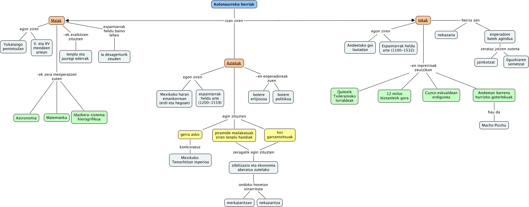 This Concept Map, created with IHMC CmapTools, has information related to: Kolonaurreko herriak, Inkak -en inpreirioak zeu(z)kan 12 milioi biztanletik gora, hiri garrantzitsuak zeragatik egin zituzten zibilizazio eta ekonomia aberatsa zutelako, Maiak -ek zera menperatzen zuten Astronomia, Aztekak -en enperadoreak zuen botere politikoa, Aztekak egin zituzten gerra asko, gerra asko konkistatuz Mexikoko Tenochtitan inperioa, Aztekak egon ziren espainiarrak heldu arte (1200-1519), zibilizazio eta ekonomia aberatsa zutelako ondoko honetan oinarrituta nekazaritza, Maiak -ek zera menperatzen zuten Idazkera-sistema hierogrifikoa, Aztekak -en enperadoreak zuen botere erlijiosoa, Inkak herria zen enperadore batek agindua, Aztekak egin zituzten hiri garrantzitsuak, Maiak espainiarrak heldu baino lehen ia desagerturik zeuden, Maiak -ek zera menperatzen zuten Matematika, Aztekak egin zituzten piramide mailakatuak ziren tenplu handiak, Inkak -en inpreirioak zeu(z)kan Andeetan barrena harrizko goterlekuak, Maiak egon ziren Yukatango penintsulan, Inkak herria zen nekazaria, Kolonaurreko herriak izan ziren Inkak, piramide mailakatuak ziren tenplu handiak zeragatik egin zituzten zibilizazio eta ekonomia aberatsa zutelako