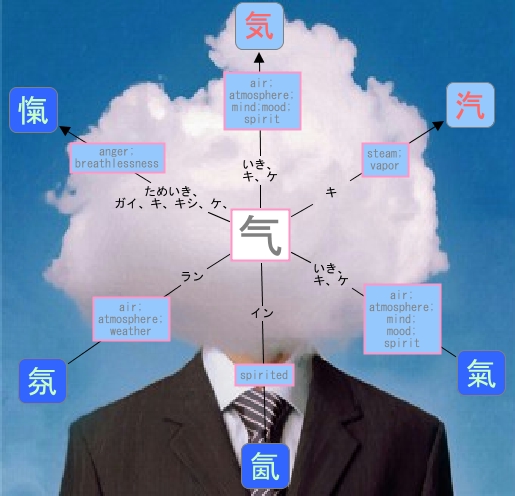 This Concept Map, created with IHMC CmapTools, has information related to: 2012.04.12 Eni, 气 ためいき、 ガイ、キ、キシ、ケ、 愾, 气 いき、 キ、ケ 氣, 气 イン 氤, 气 ラン 氛, 气 いき、 キ、ケ 気, 气 キ 汽