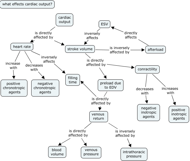 This Concept Map, created with IHMC CmapTools, has information related to: D.Cardona-Cardiac output cmap, stroke volume is inversely affected by afterload, venous return is directly affected by venous pressure, heart rate inversely affects filling time, venous return is inversely affected by intrathoracic pressure, conractility decreases with negative inotropic agents, venous return is directly affected by blood volume, preload due to EDV is directly affected by venous return, ESV inversely affects stroke volume, stroke volume is directly affected by preload due to EDV, preload due to EDV is directly affected by filling time, conractility increases with positive inotropic agents, afterload directly affects ESV, heart rate decreases with negative chronotropic agents, cardiac output is directly affected by stroke volume, stroke volume is directly affected by conractility, cardiac output is directly affected by heart rate, heart rate increase with positive chronotropic agents