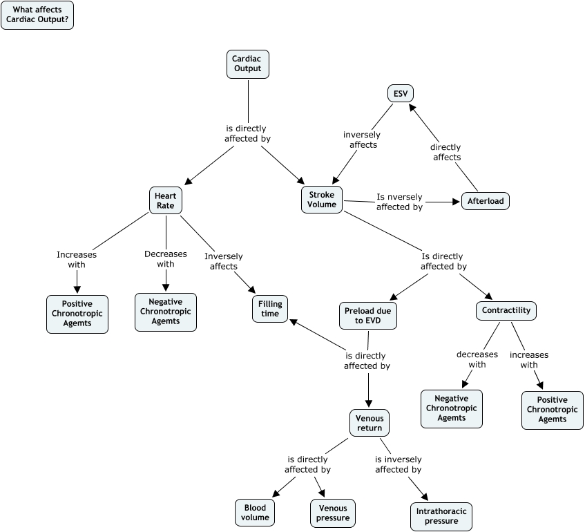 This Concept Map, created with IHMC CmapTools, has information related to: DavidOrtizTutorial, Stroke Volume Is nversely affected by Afterload, Venous return is inversely affected by Intrathoracic pressure, Contractility decreases with Negative Chronotropic Agemts, Heart Rate Decreases with Negative Chronotropic Agemts, Preload due to EVD is directly affected by Venous return, Stroke Volume Is directly affected by Contractility, Cardiac Output is directly affected by Heart Rate, Afterload directly affects ESV, Stroke Volume Is directly affected by Preload due to EVD, Heart Rate Inversely affects Filling time, Heart Rate Increases with Positive Chronotropic Agemts, Preload due to EVD is directly affected by Filling time, Venous return is directly affected by Venous pressure, Cardiac Output is directly affected by Stroke Volume, Contractility increases with Positive Chronotropic Agemts, ESV inversely affects Stroke Volume, Venous return is directly affected by Blood volume
