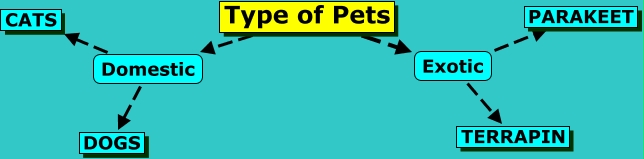 This Concept Map, created with IHMC CmapTools, has information related to: Types of pets, Type of Pets Domestic, Domestic CATS, Exotic TERRAPIN, Exotic PARAKEET, Type of Pets Exotic, Domestic DOGS