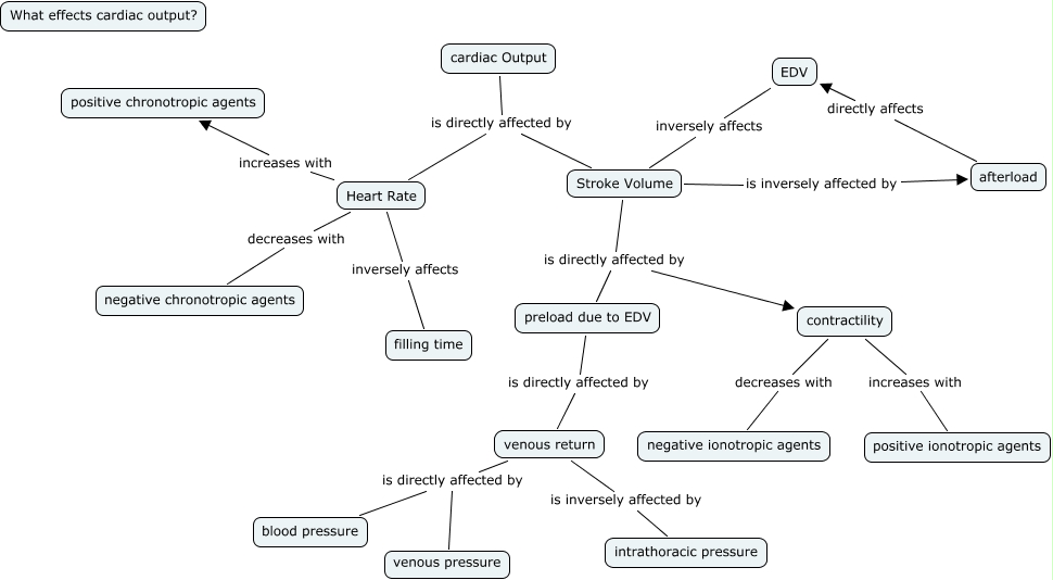 This Concept Map, created with IHMC CmapTools, has information related to: SaliniNaiduTutorial, afterload directly affects EDV, Stroke Volume is inversely affected by afterload, Heart Rate inversely affects filling time, cardiac Output is directly affected by Stroke Volume, Stroke Volume is directly affected by preload due to EDV, EDV inversely affects Stroke Volume, Heart Rate decreases with negative chronotropic agents, Heart Rate increases with positive chronotropic agents, cardiac Output is directly affected by Heart Rate, venous return is directly affected by venous pressure, venous return is directly affected by blood pressure, venous return is inversely affected by intrathoracic pressure, preload due to EDV is directly affected by venous return, contractility increases with positive ionotropic agents, Stroke Volume is directly affected by contractility, contractility decreases with negative ionotropic agents