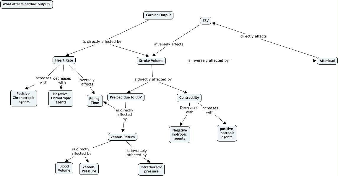 This Concept Map, created with IHMC CmapTools, has information related to: LisaJonesTutorial, Stroke Volume is directly affected by Preload due to EDV, Preload due to EDV is directly affected by Filling TIme, Venous Return is inversely affected by Intrathoracic pressure, Afterload directly affects ESV, Contractilty Decreases with Negative inotropic agents, Stroke Volume is inversely affected by Afterload, Preload due to EDV is directly affected by Venous Return, Stroke Volume is directly affected by Contractilty, Venous Return is directly affected by Blood Volume, Cardiac Output Is directly affected by Stroke Volume, Heart Rate increases with Positive Chronotropic agents, Heart Rate decreases with Negative Chrontropic agents, ESV inversely affects Stroke Volume, Contractilty increases with positive Inotropic agents, Venous Return is directly affected by Venous Pressure, Heart Rate inversely affects Filling TIme, Cardiac Output Is directly affected by Heart Rate