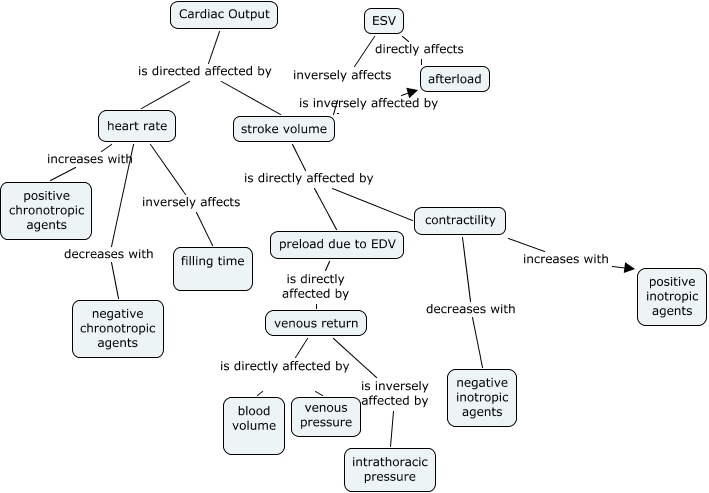 This Concept Map, created with IHMC CmapTools, has information related to: Gwen Bernacki's Concept Map, contractility increases with positive inotropic agents, venous return is directly affected by venous pressure, venous return is directly affected by blood volume, preload due to EDV is directly affected by venous return, heart rate decreases with negative chronotropic agents, contractility decreases with negative inotropic agents, stroke volume is inversely affected by afterload, heart rate increases with positive chronotropic agents, ESV inversely affects stroke volume, Cardiac Output is directed affected by stroke volume, venous return is inversely affected by intrathoracic pressure, ESV directly affects afterload, heart rate inversely affects filling time, stroke volume is directly affected by preload due to EDV, stroke volume is directly affected by contractility, Cardiac Output is directed affected by heart rate