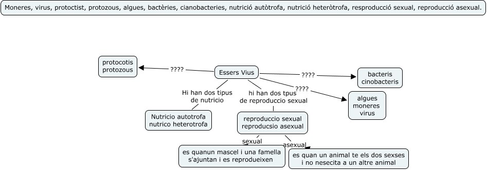Aquest mapa conceptual conté informació relacionada amb: Sense títol 3, Essers Vius ???? bacteris cinobacteris, Essers Vius ???? algues moneres virus, Essers Vius hi han dos tpus de reproduccio sexual reproduccio sexual reproducsio asexual, reproduccio sexual reproducsio asexual sexual es quanun mascel i una famella s'ajuntan i es reprodueixen, Essers Vius ???? protocotis protozous, Essers Vius Hi han dos tipus de nutricio Nutricio autotrofa nutrico heterotrofa, reproduccio sexual reproducsio asexual asexual es quan un animal te els dos sexses i no nesecita a un altre animal
