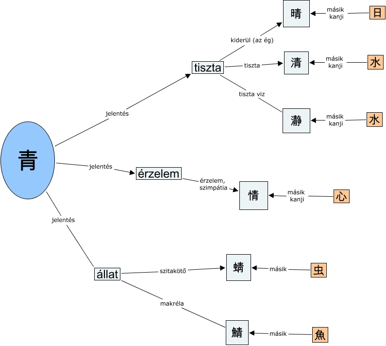 This Concept Map, created with IHMC CmapTools, has information related to: 20120419 FH, 虫 másik 蜻, 青 jelentés tiszta, 水 másik kanji 清, állat szitakötő 蜻, érzelem érzelem, szimpátia 情, 青 jelentés állat, tiszta kiderül (az ég) 晴, 青 jelentés érzelem, 日 másik kanji 晴, 魚 másik 鯖, 心 másik kanji 情, állat makréla 鯖, tiszta tiszta 清, tiszta tiszta viz 瀞, 水 másik kanji 瀞
