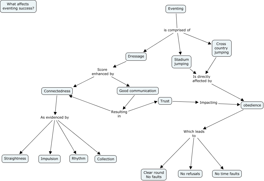This Concept Map, created with IHMC CmapTools, has information related to: Kellie Cochran, obedience Which leads to Clear round No faults, Cross country jumping Is directly affected by obedience, Connectedness As evidenced by Rhythm, Dressage Score enhanced by Connectedness, Stadium jumping Is directly affected by obedience, Trust Impacting obedience, Eventing is comprised of Cross country jumping, Connectedness As evidenced by Collection, obedience Which leads to No time faults, Good communication Resulting in Connectedness, Eventing is comprised of Stadium jumping, Dressage Score enhanced by Good communication, Eventing is comprised of Dressage, obedience Which leads to No refusals, Good communication Resulting in Trust, Connectedness As evidenced by Impulsion, Connectedness As evidenced by Straightness