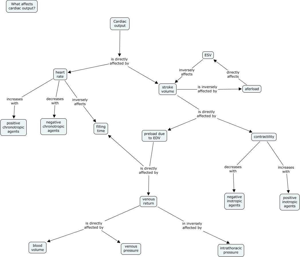 This Concept Map, created with IHMC CmapTools, has information related to: Jeffreypu tutorial, stroke volume is directly affected by preload due to EDV, heart rate decreases with negative chronotropic agents, ESV inversely affects stroke volume, heart rate increases with positive chronotropic agents, Cardiac output is directly affected by heart rate, stroke volume is inversely affected by aferload, venous return is directly affected by blood volume, venous return is directly affected by venous pressure, contractility increases with positive inotropic agents, aferload directly affects ESV, stroke volume is directly affected by contractility, Cardiac output is directly affected by stroke volume, contractility decreases with negative inotropic agents, venous return in inversely affected by intrathoracic pressure, preload due to EDV is directly affected by venous return, preload due to EDV is directly affected by filling time, heart rate inversely affects filling time