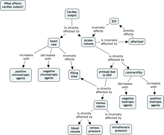 This Concept Map, created with IHMC CmapTools, has information related to: Cardiac output, afterload directly affects ESV, stroke volume is directly affected by preload due to EDV, preload due to EDV is directly affected by filling time, ESV inversely affects stroke volume, venous return is directly affected by blood volume, Cardiac output Is directly affected by heart rate, venous return is directly affected by venous pressure, contractility increases with positive inotropic agents, stroke volume is inversely affected by afterload, heart rate decreases with negative chronotropic agents, stroke volume is directly affected by contractility, heart rate increases with positive chronotropic agents, preload due to EDV is directly affected by venous return, heart rate inversely affects filling time, contractility decreases with negative inotropic agents, venous return is inversely affected by intrathoracic pressure, Cardiac output Is directly affected by stroke volume