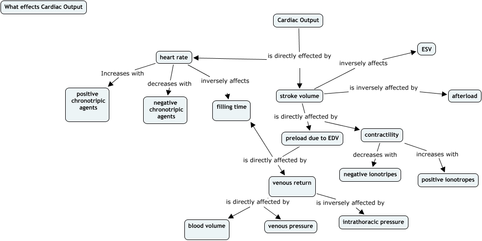 This Concept Map, created with IHMC CmapTools, has information related to: MattReinTutorial, heart rate Increases with positive chronotripic agents, Cardiac Output is directly effected by stroke volume, contractility decreases with negative ionotripes, venous return is directly affected by blood volume, contractility increases with positive ionotropes, Cardiac Output is directly effected by heart rate, preload due to EDV is directly affected by filling time, stroke volume is inversely affected by afterload, heart rate inversely affects filling time, heart rate decreases with negative chronotripic agents, stroke volume is directly affected by contractility, venous return is directly affected by venous pressure, venous return is inversely affected by intrathoracic pressure, stroke volume inversely affects ESV, preload due to EDV is directly affected by venous return, stroke volume is directly affected by preload due to EDV